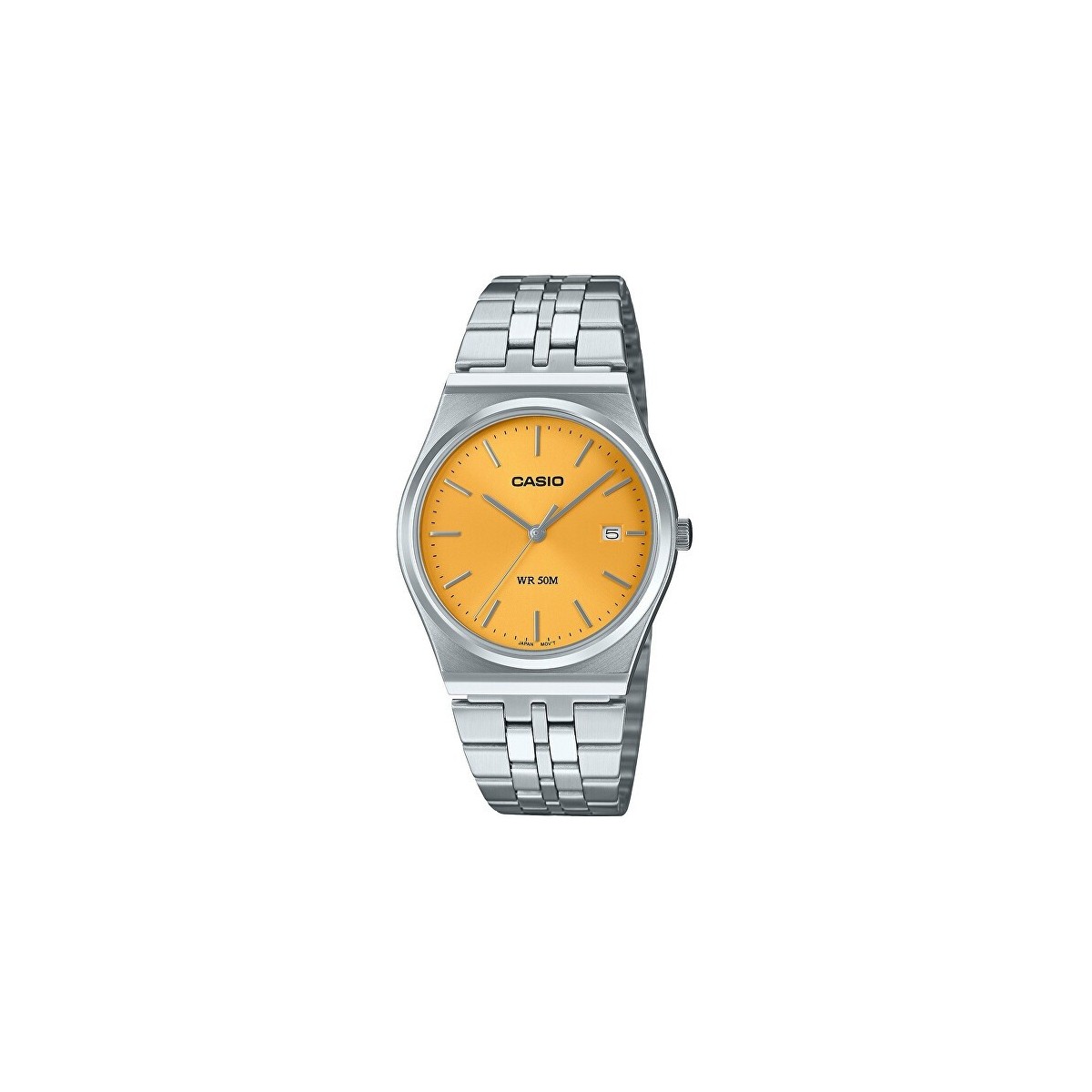 Orologio maschile Casio, della collezione Casio Collection, con funzione di solo tempo con giorno e data al quarzo. L'orologio è realizzato con bracciale in acciaio, cassa 40 mm montante vetro minerale e quadrante color giallo con indici a bastoni e datario a ore 3. Chiusura one-touch a tre pieghe.