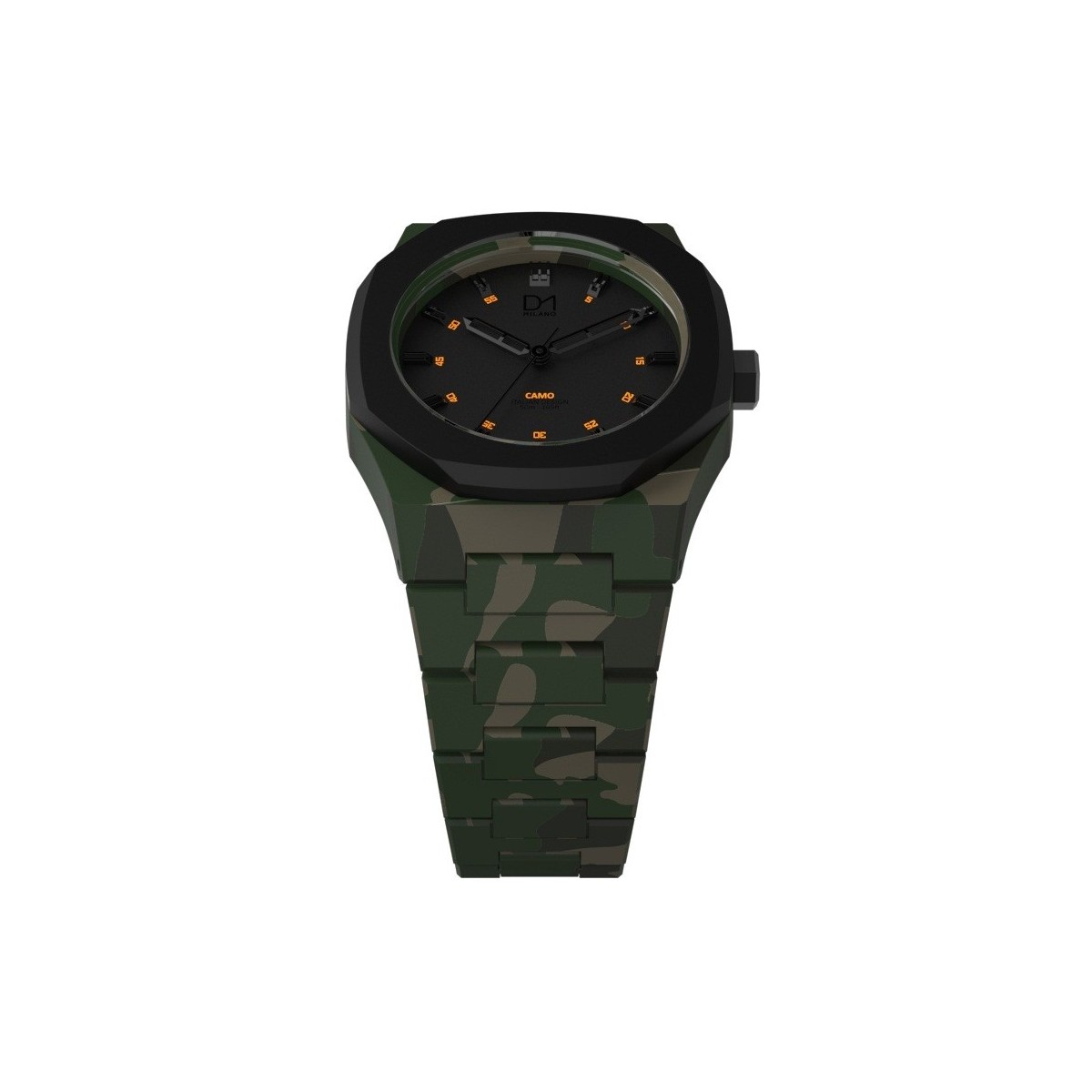 D1 MILANO CAMO - DIMENSIONE CASSA: 40 MM ; - MATERIALE: Policarbonato con rivestimento Soft Touch applicato manualmente ; - CINTURINO: Cinturino a maglie ; - QUADRANTE: Stampato UV ; - VETRO: Minerale Composito ; - INDICI: Diamond cut ; - FIBBIA: 316 L in Acciaio inossidabile ; - FONDO CASSA: in Acciaio PVD 316L con quattro viti ; - MOVIMENTO: Miyota solo tempo ; - GHIERA:Policarbonato con rivestimento Soft Touch applicato manualmente
