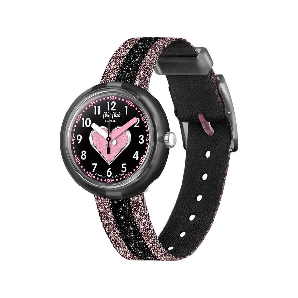 Orologio per bambini con brillantini neri e rosa. Orologio ideale per imparare a leggere l'ora ai bambini.