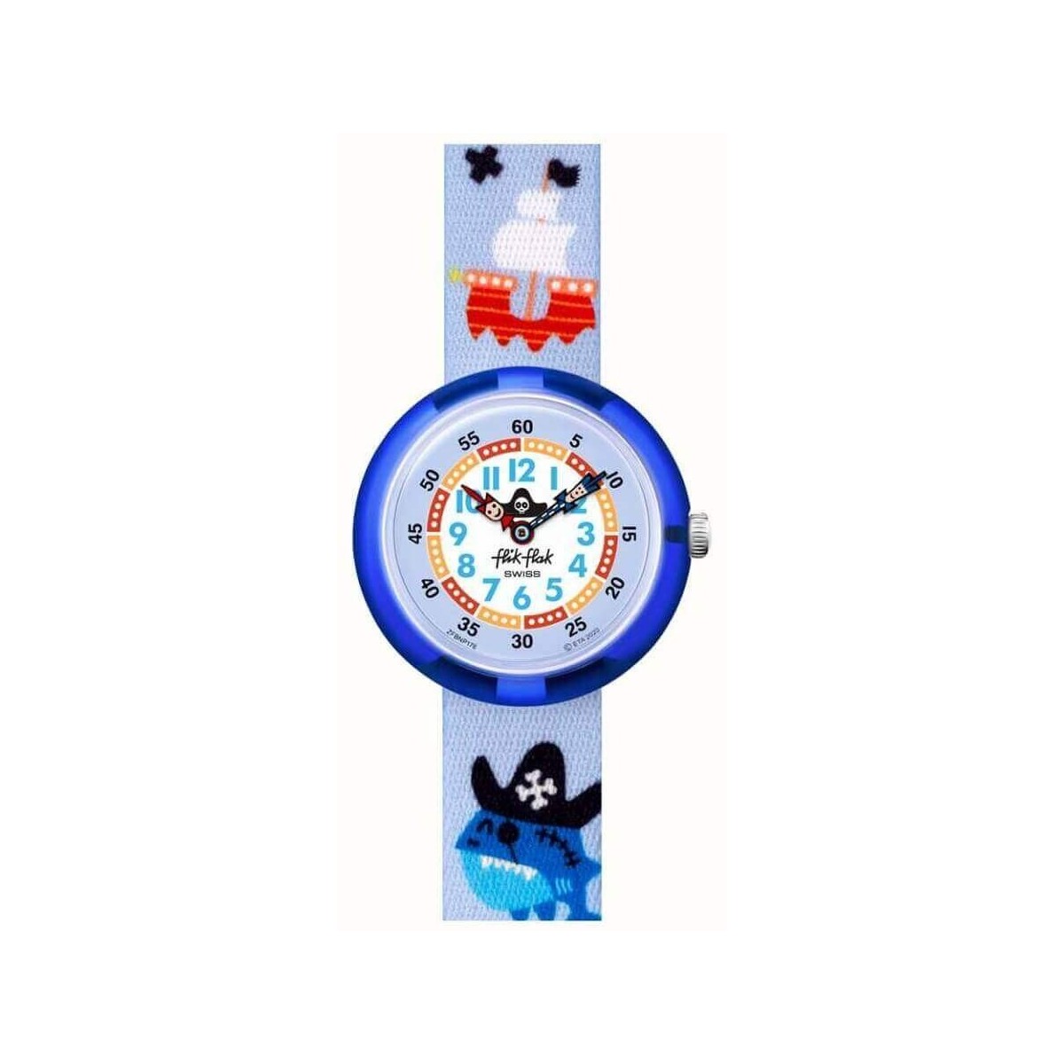 Imparare l'ora con Flik Flak non è mai stato così semplice e divertente. Questo orologio per bambini della collezione Magical Ocean è realizzato con cinturino in tessuto PET riciclato di colore celeste raffigurante pirati e creature del mare in versione piratesca, ha una cassa blu di 32 mm in plastica di origine biologica e quadrante bicolore bianco e celeste e lancette con Flik e Flak. Funzione di solo tempo e movimento al quarzo.