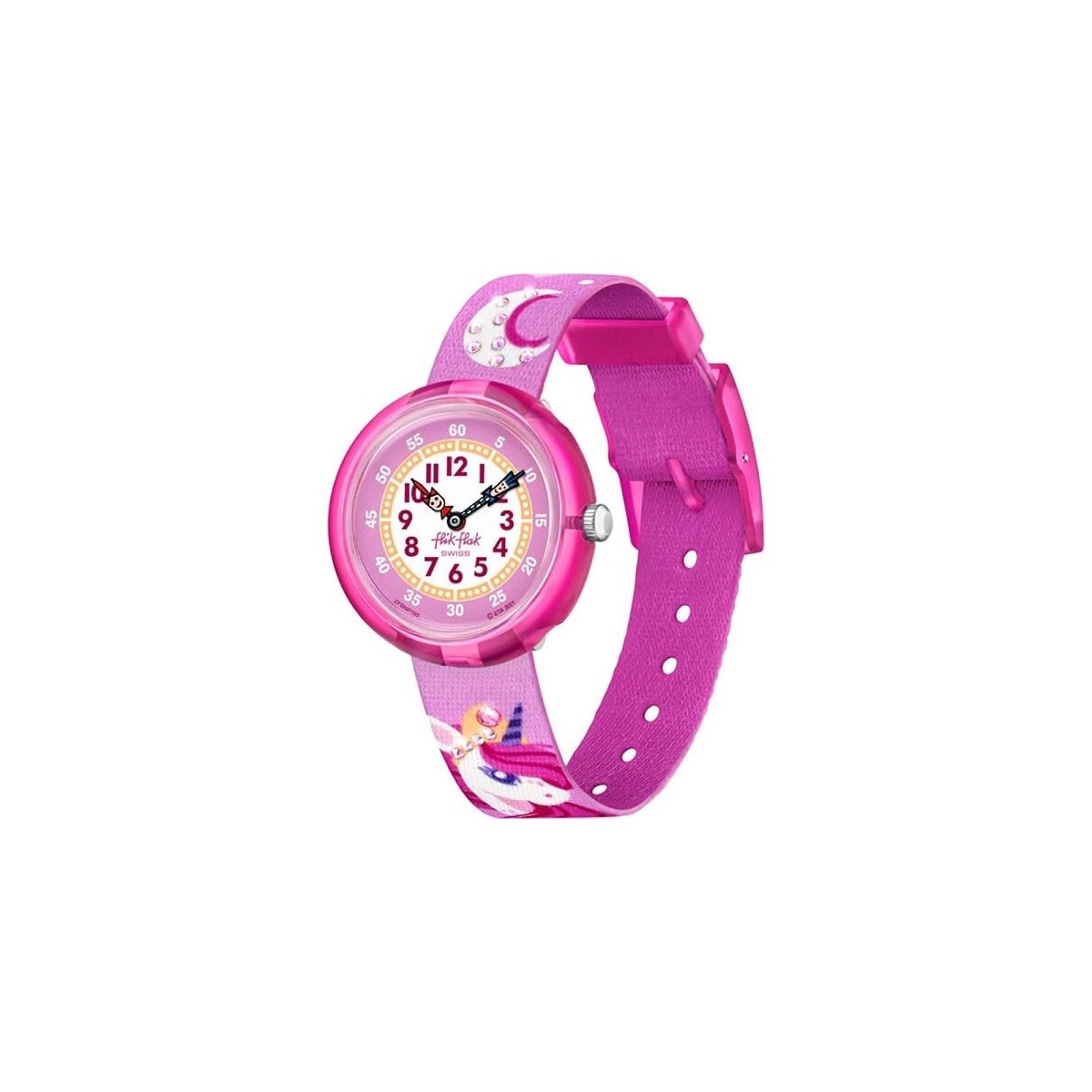 Imparare l'ora con Flik Flak non è mai stato così semplice e divertente. Questo orologio della collezione Dreaming Unicorn per bambini è realizzato con cinturino in tessuto PET riciclato di colore viola con motivo unicorni, ha una cassa rosa di 32 mm in plastica di origine biologica, quadrante bicolore viola e bianco con lancette blu e rosa. Funzione di solo tempo e movimento al quarzo.