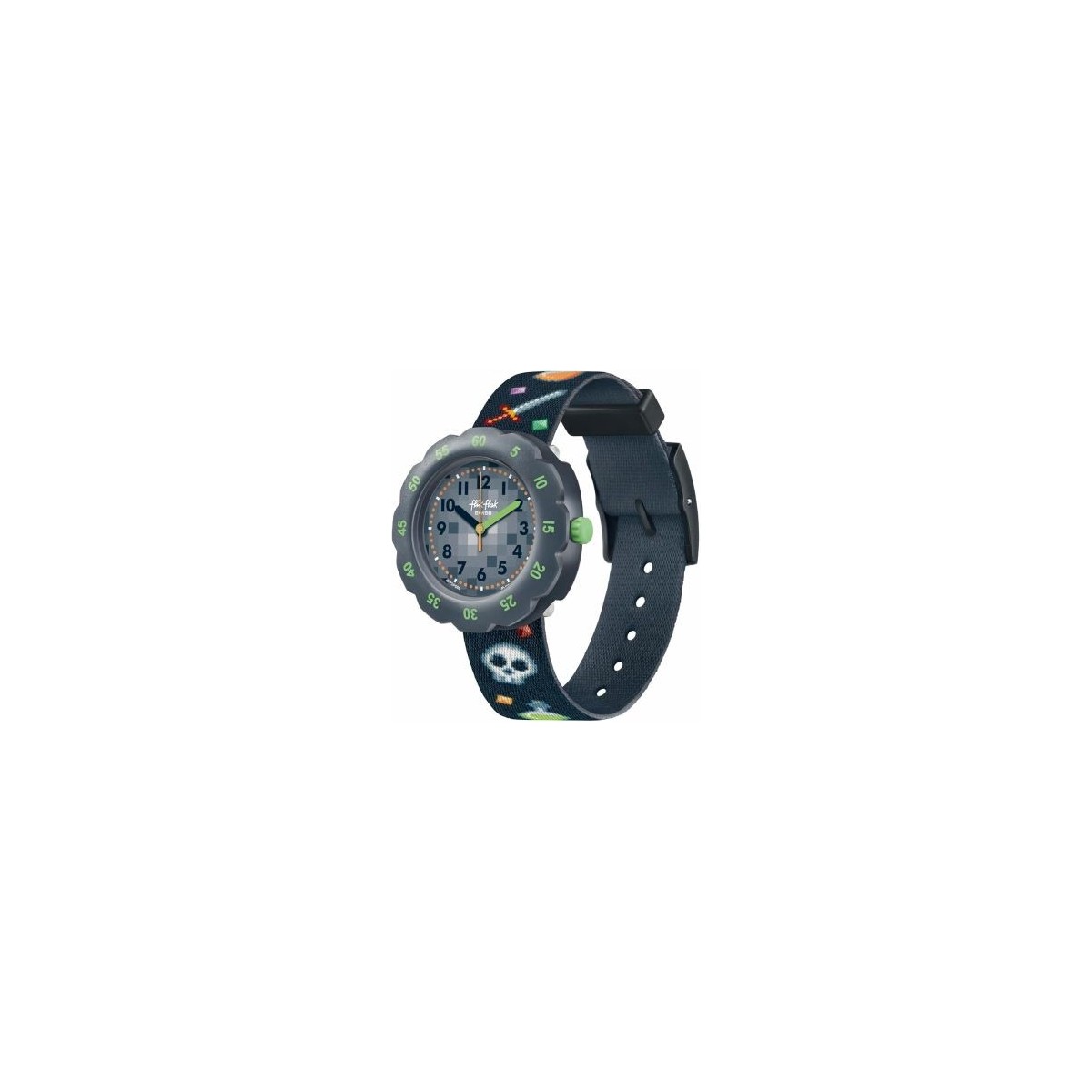 Orologio per bambini Flik Flak Gaming World con cassa in plastica da 34,75 mm di colore nero con effetto pixel e cinturino in fibbia con fantasia teschi gamer.