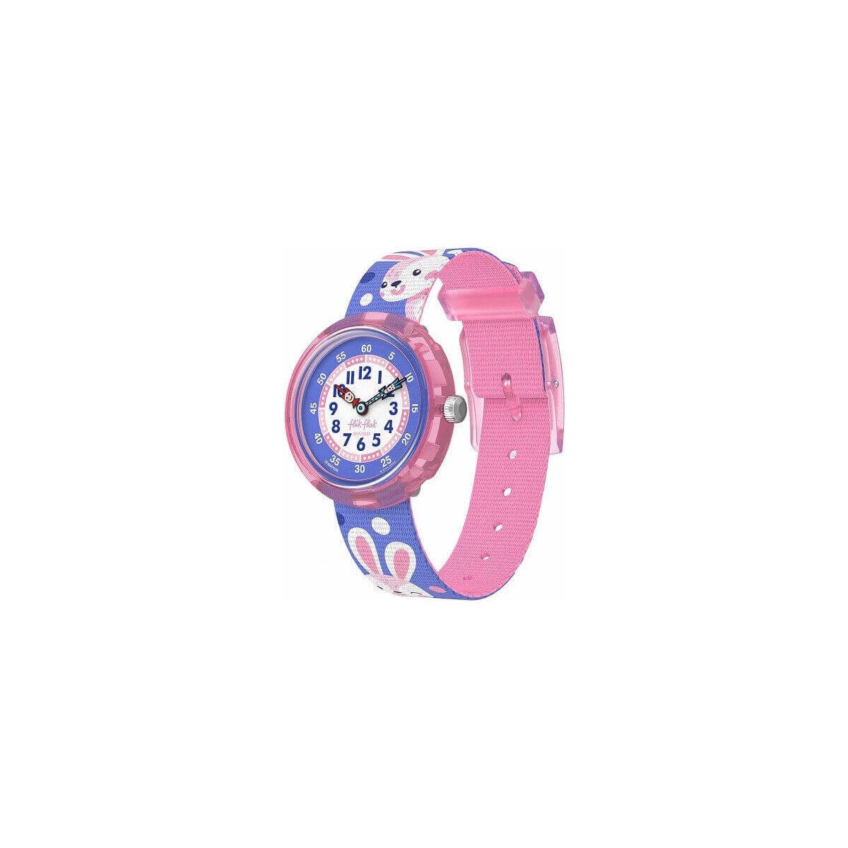 Questo orologio della collezione Peek a Bunny per bambini è realizzato con cinturino viola con stampato un simpatico coniglietto, in tessuto PET riciclato, ha una cassa trasparente di 32 mm in plastica di origine biologica, quadrante viola con lancette rosa e blu. Funzione di solo tempo e movimento al quarzo.