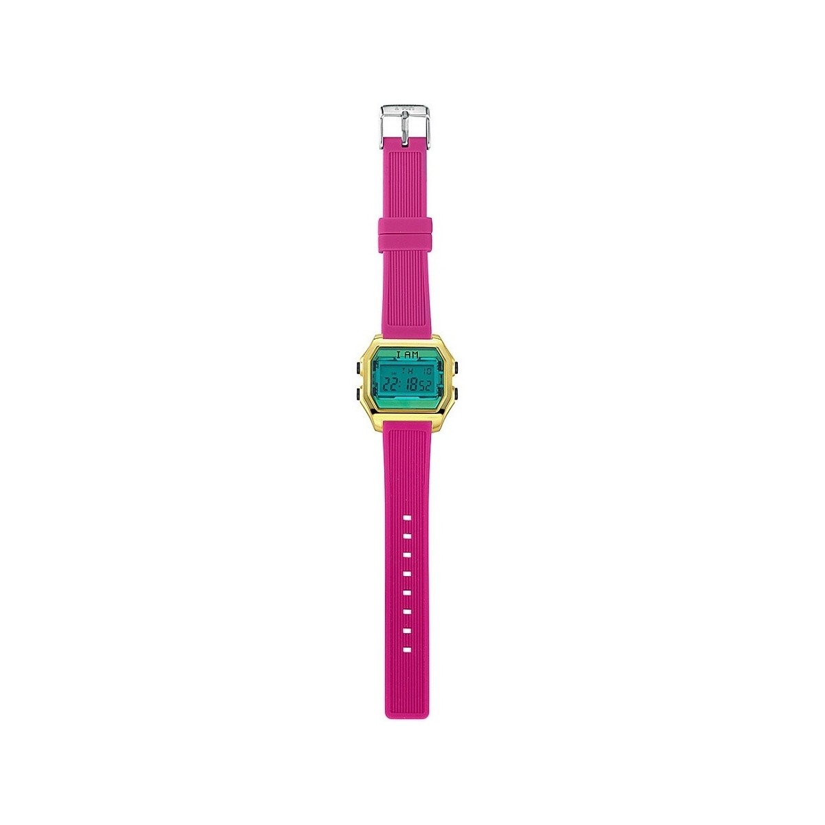 Orologio digitale Donna I AM con cassa in policarbonato effetto metallo colore oro con vetro verde e cinturino in silicone fucsia con fibbia in acciaio. Funzioni: Mese, Data, Antimeridiane/Pomeridiane, Luce, Suoneria, Cronometro, Segnale Orario, Sistama Orario 12/24 Ore. La Resistenza All'Acqua È Di 5 Atm. Orologio Dotato Di Movimento Digitale J8519.