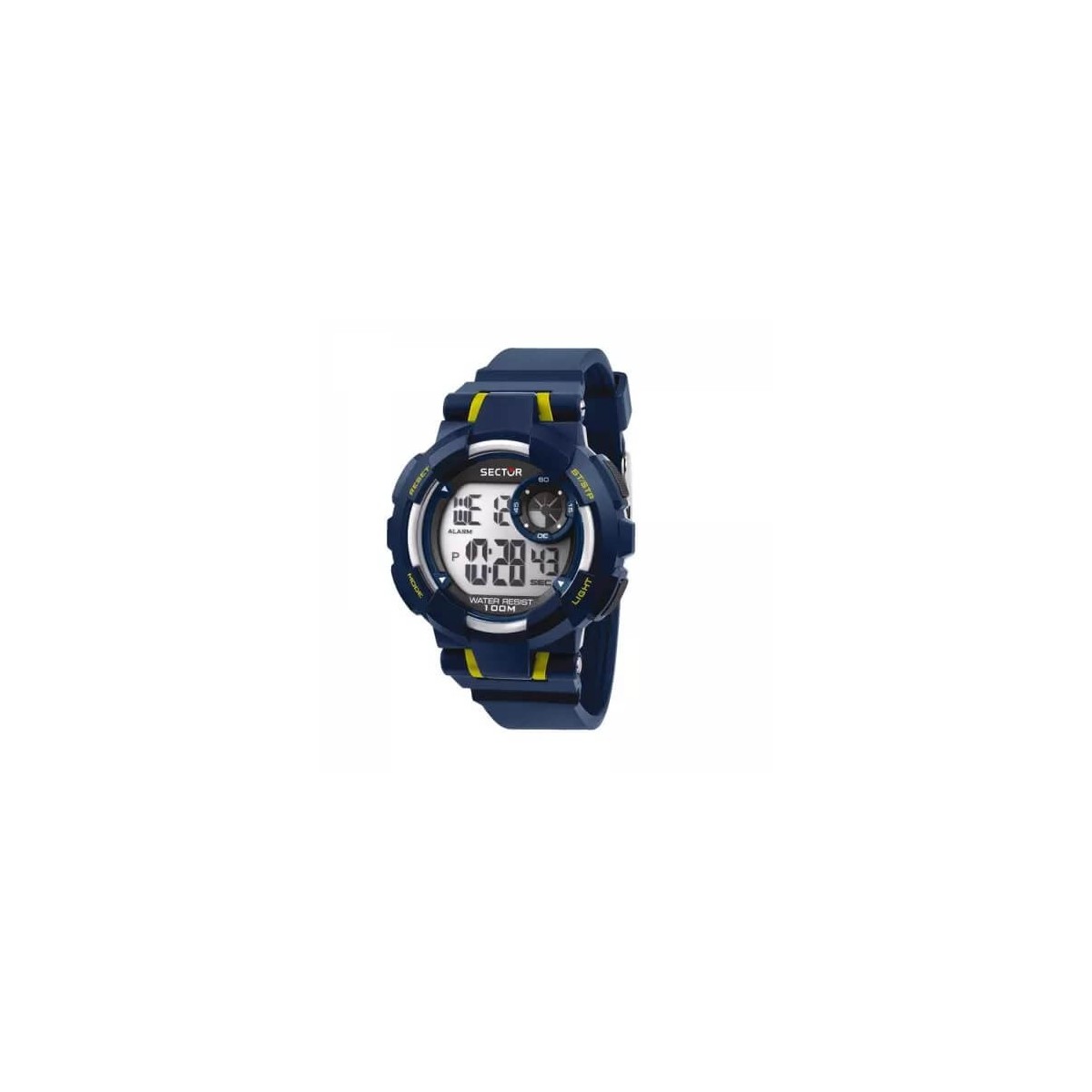 Orologio maschile Sector, della collezione Ex-36, con cassa di 45 mm, vetro e cinturino in poliuretano blu con dettagli di colore giallo, con chiusura fibbia ad ardiglione e movimento digitale.