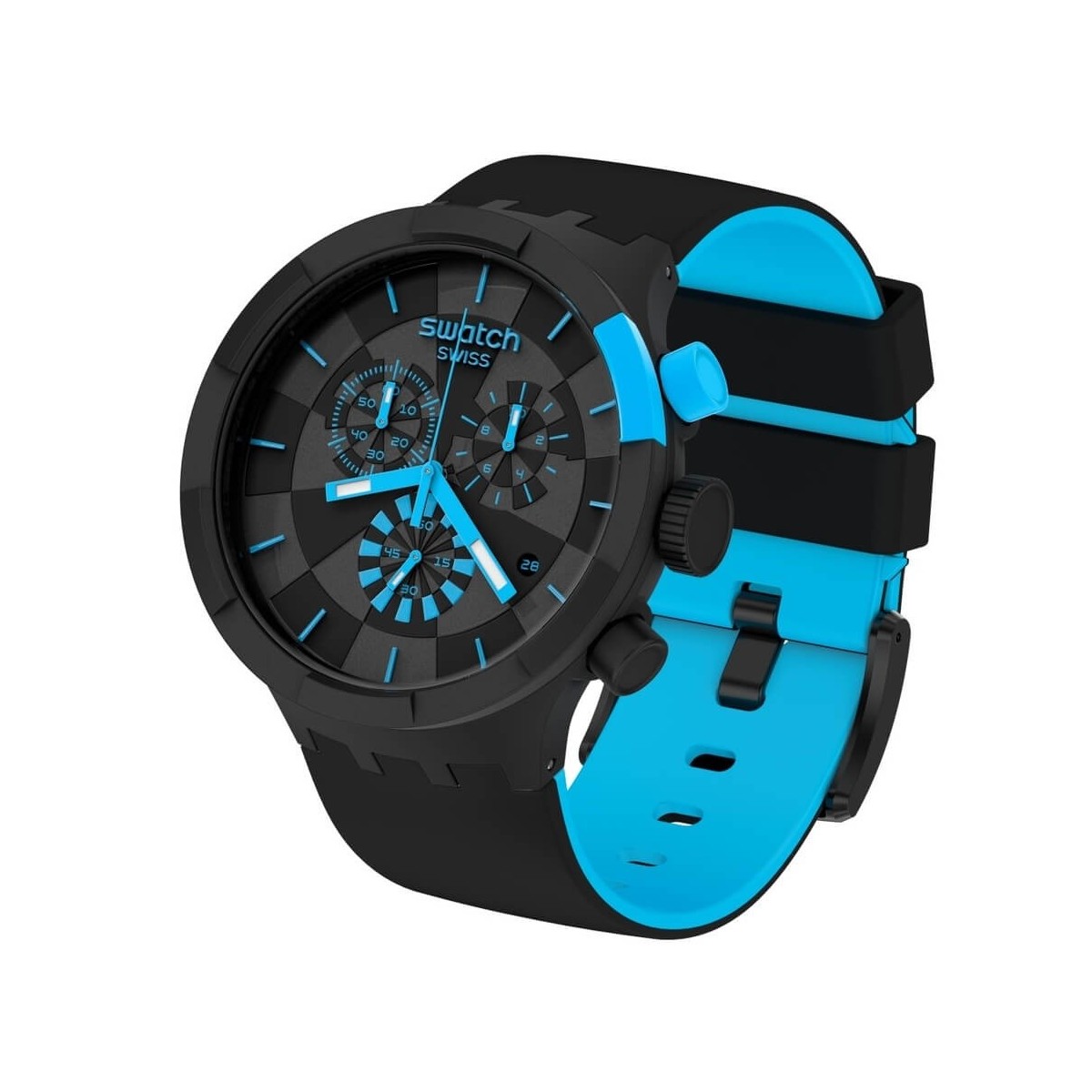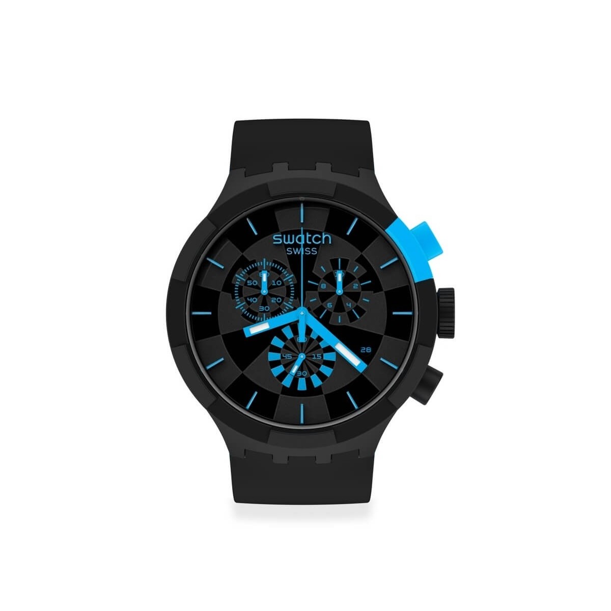 Orologio Swatch checkpoint blue della collezione Big Bold Chrono con movimento cronometro al quarzo, cassa in plastica di colore nero e di forma rotonda da 47 mm e cinturino in silicone doppio strato di colore nero e blu
