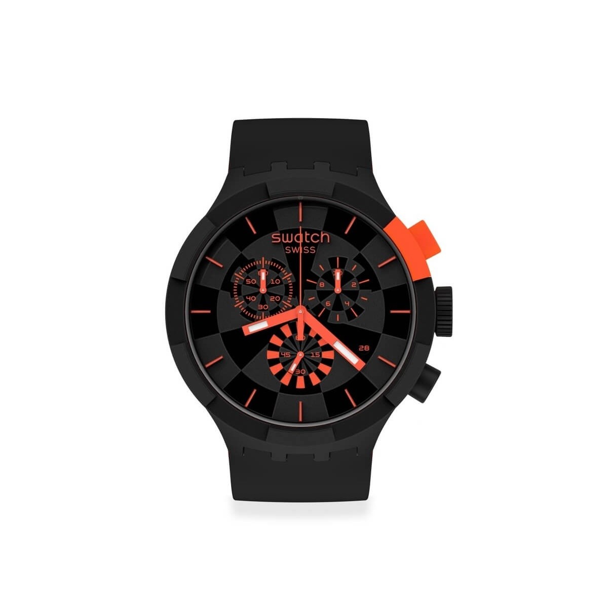 Orologio Swatch checkpoint red della collezione Big Bold Chrono con movimento cronometro al quarzo, cassa in plastica di colore nero e di forma rotonda da 47 mm e cinturino in silicone doppio strato di colore nero e rosso
