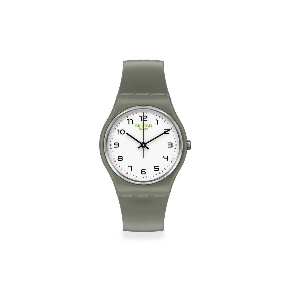 Orologio Swatch isikhathi della collezione GENT 2 con movimento solo tempo al quarzo, cassa in plastica di origine biologica di colore verde e di forma rotonda da 34 mm e cinturino in plastica morbida di origine biologica di colore verde