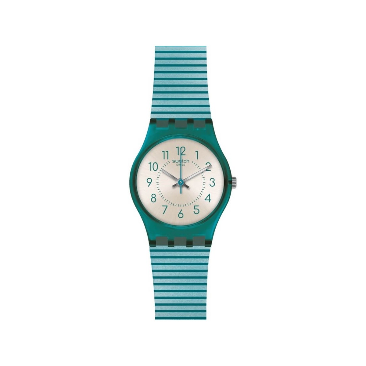 Orologio Swatch phard kissed della collezione Lady con movimento solo tempo al quarzo, cassa in plastica di colore blu-verde trasparente e di forma rotonda da 25 mm e cinturino in silicone di colore blu-verde con stampa blu - effetto anodizzato