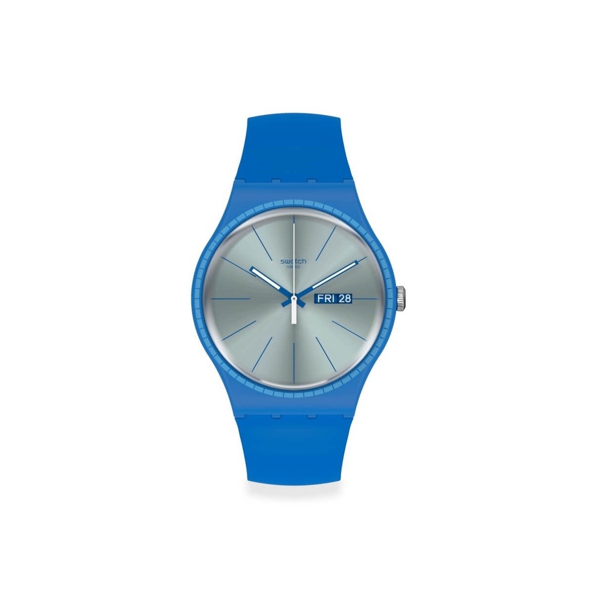 Orologio Swatch blue rails della collezione New Gent con movimento solo tempo al quarzo, cassa in plastica di colore blu e di forma rotonda da 41 mm e cinturino in silicone di colore blu