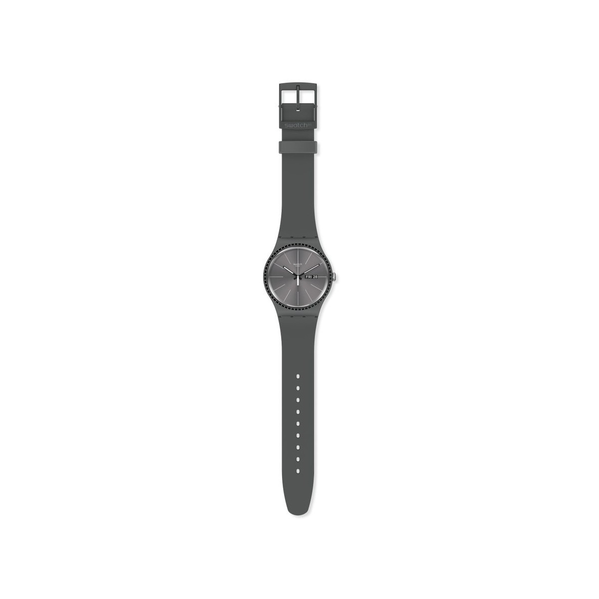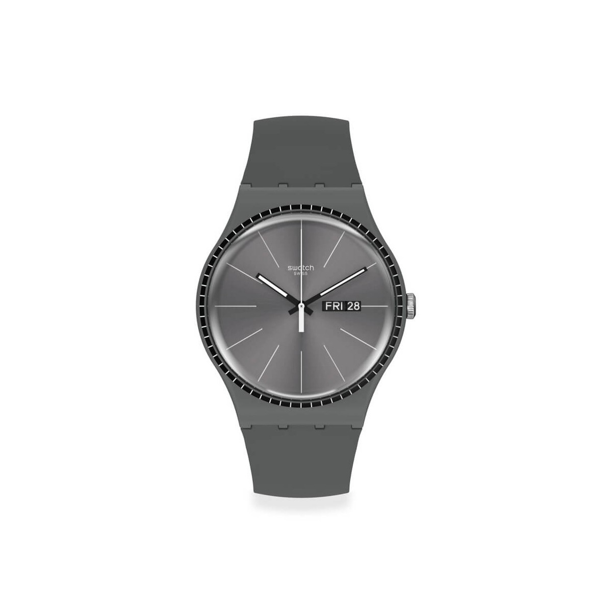 Orologio Swatch grey rails della collezione New Gent con movimento solo tempo al quarzo, cassa in plastica di colore grigio scuro e di forma rotonda da 41 mm e cinturino in silicone di colore grigio scuro