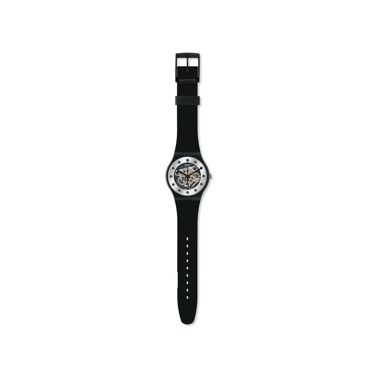 Orologio Swatch silver glam della collezione New Gent Lacquered con movimento solo tempo al quarzo, cassa in plastica di colore nero e di forma rotonda da 41 mm e cinturino in silicone di colore nero