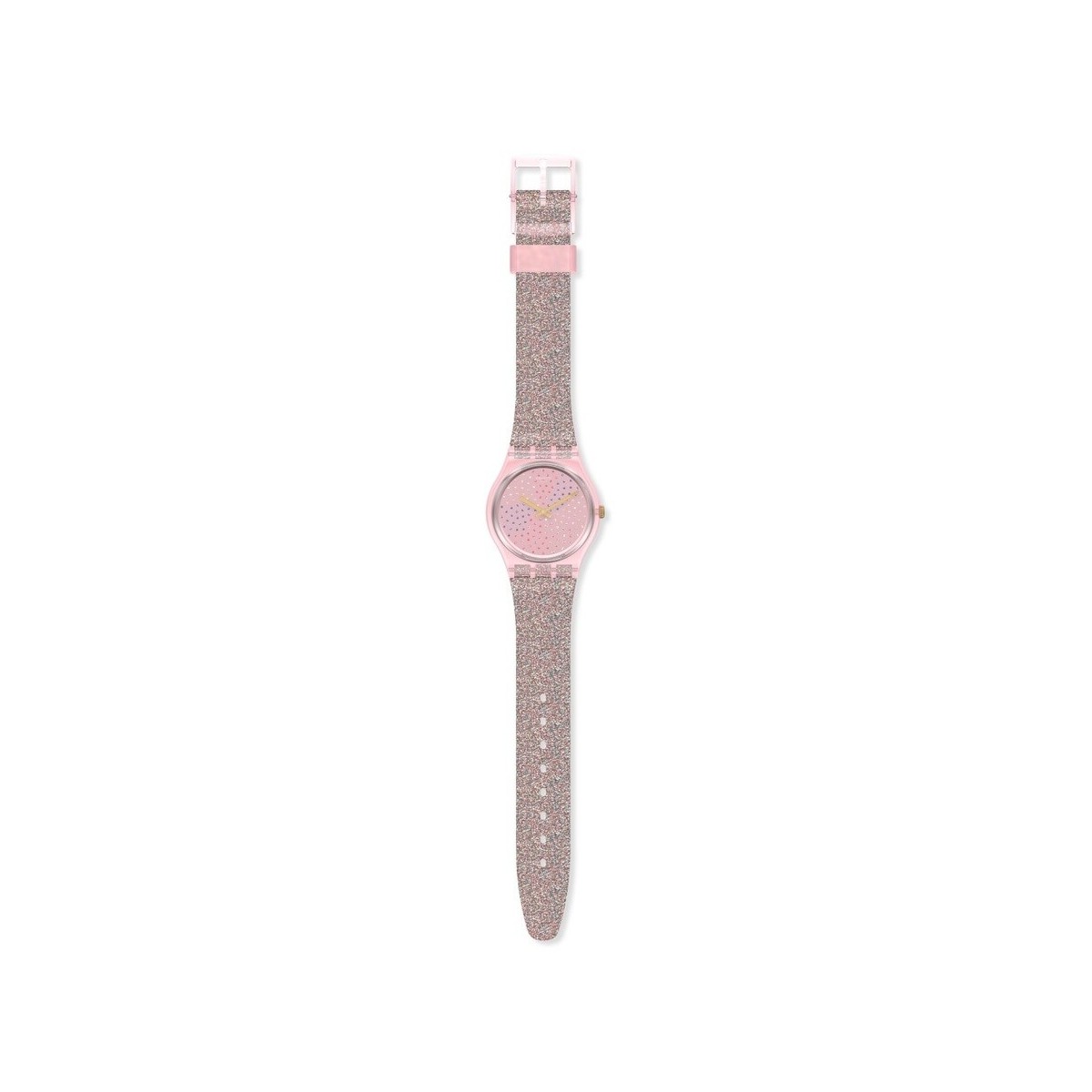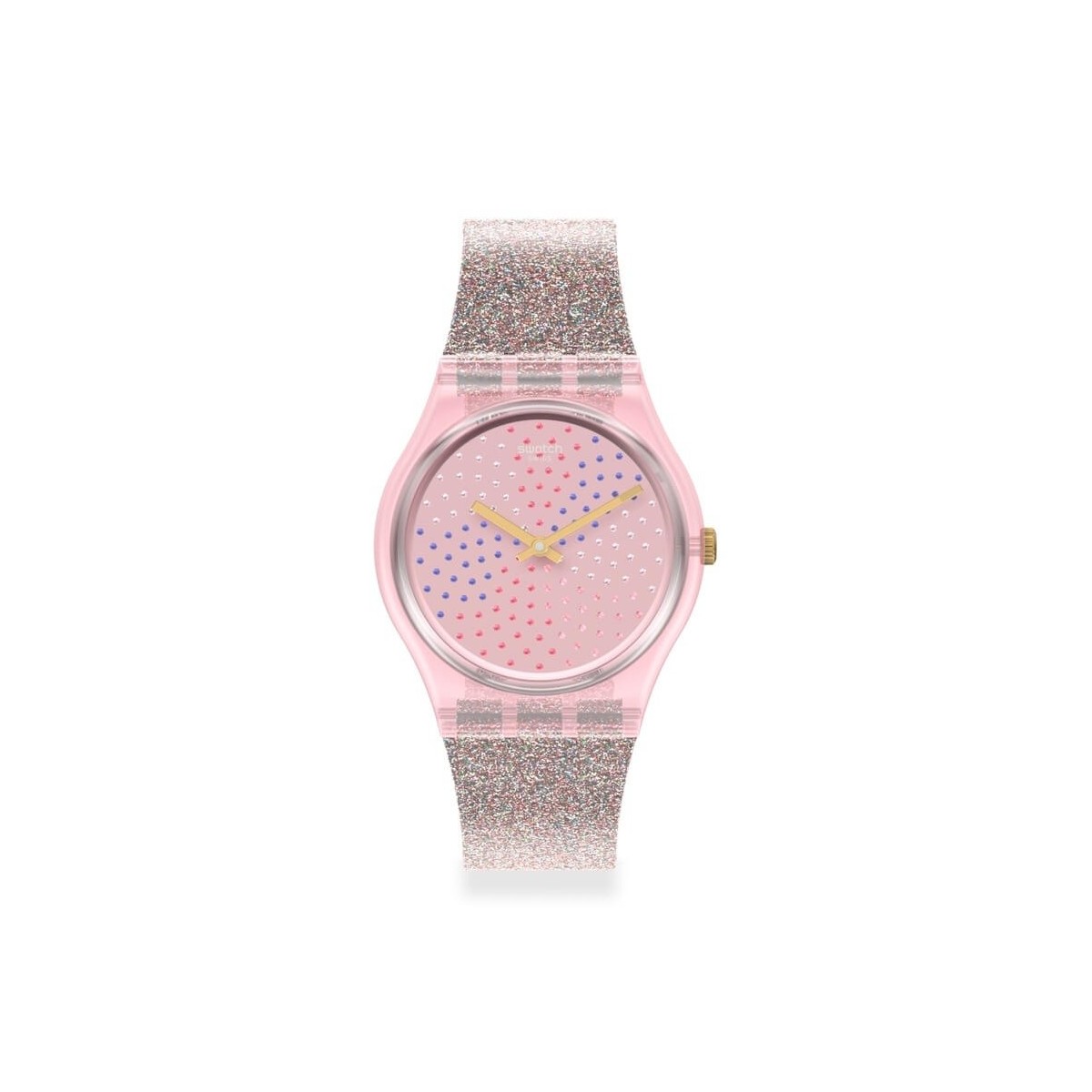 Orologio Swatch multilumino della collezione Gent Standard con movimento solo tempo al quarzo, cassa in plastica di colore rosa trasparente e di forma rotonda da 34 mm e cinturino in silicone di colore rosa con glitter multicolori