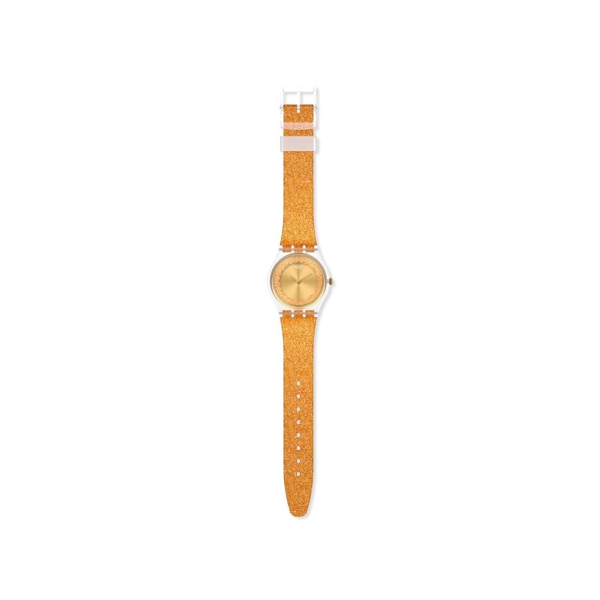 Orologio Swatch sparklingot della collezione Gent Standard con movimento solo tempo al quarzo, cassa in plastica di colore trasparente e di forma rotonda da 34 mm e cinturino in silicone di colore trasparente con glitter dorati