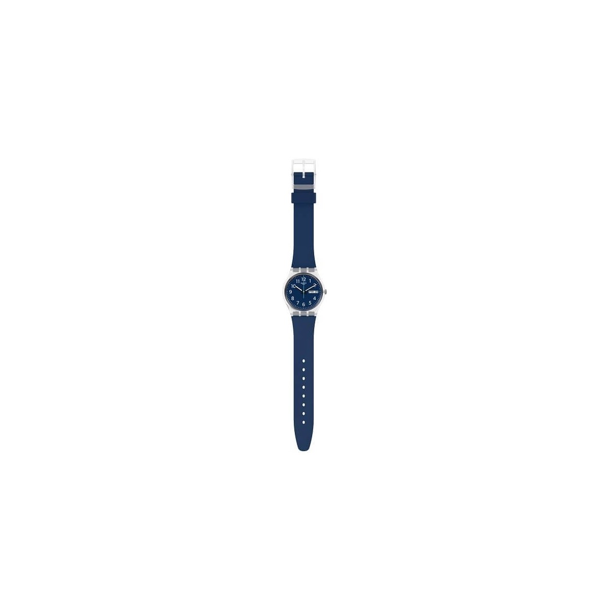 Orologio Swatch Rinse Repeat, della collezione Gent Monthly Drops, con cassa trasparente rotonda in plastica del diametro di 34 mm con quadrante blu, lancette luminescenti e cinturino in materiale di origine biologica blu opaco. Movimento al quarzo.