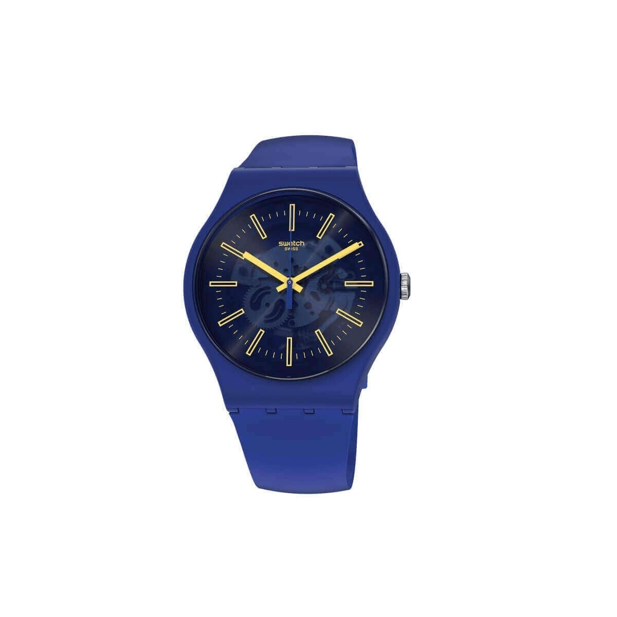 Orologio Swatch New Gent Sunbrush Sky, della collezione Monthly Drops, con funzione di solo tempo e movimento al quarzo. Orologio Biosourced, ovvero realizzato interamente con materiali di origine biologica, è caratterizzato da cinturino blu opaco con cassa 41 mm dello stesso colore e quadrante di colore blu spazzolato che lascia intravedere il movimento. Indici e lancette gialle per creare un contrasto strong e moderno. Chiusura con fibbia.