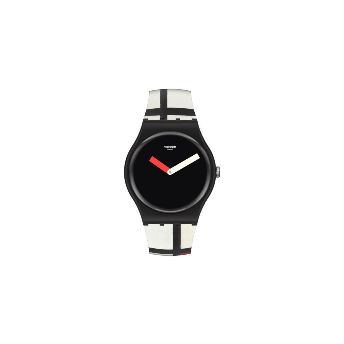 Orologio Swatch New Gent con funzione di solo tempo e movimento al quarzo. Da una collaborazione con il museo Centre Pompidou nasce questo orologio che celebra il dipinto più famoso di Piet Mondrian "Composition en Rouge, Bleu et Blanc II" . Orologio realizzato da cinturino in silicone nero opaco con stampa completa del dipinto, cassa 41 mm con quadrante nero che fa da sfondo alle lancette di colore rosso e bianco.