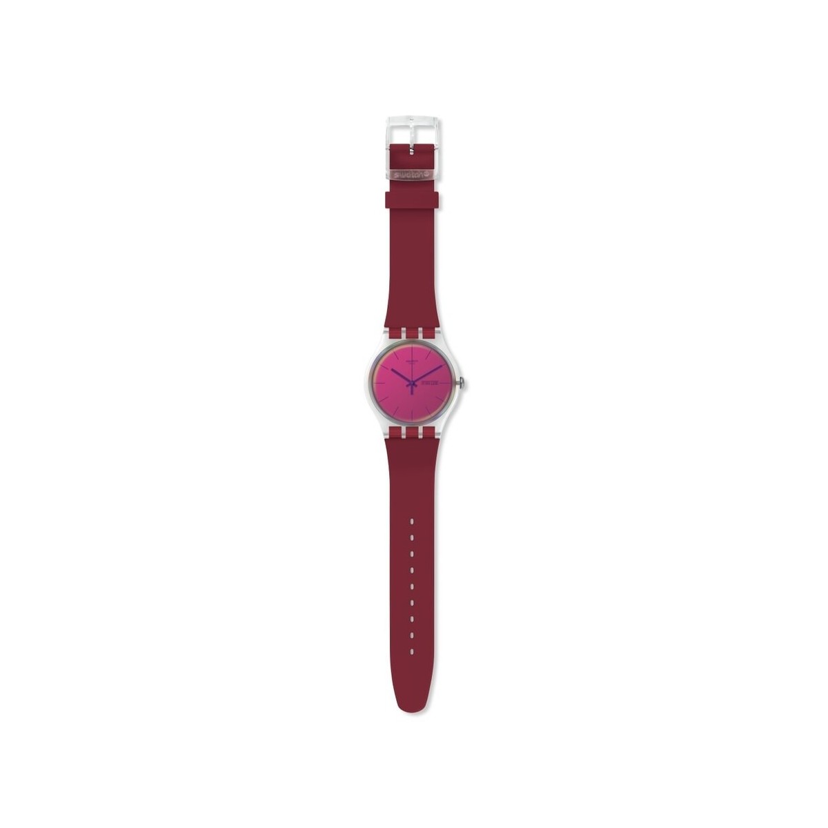 Orologio Swatch polared della collezione New Gent con movimento solo tempo al quarzo, cassa in plastica di colore trasparente e di forma rotonda da 41 mm e cinturino in silicone di colore bordeaux.