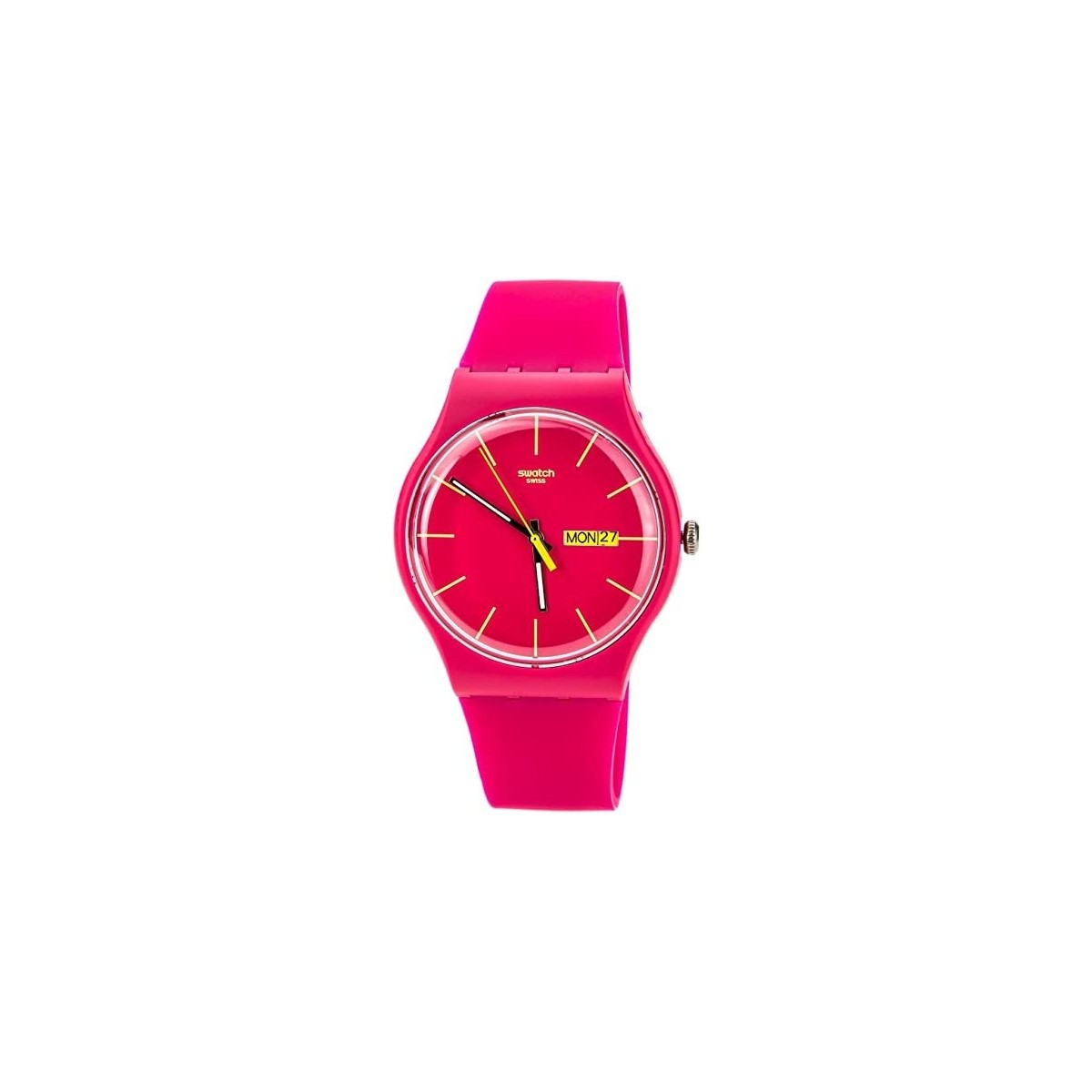 Orologio femminile Rubine Rebel della Swatch, collezione New Gent Coloured, con funzione di solo tempo e movimento al quarzo. L'orologio presenta un cinturio in silicone di colore fucsia, con cassa 41 mm della stessa tonalità e quadrante fucsia con indici e lancetta dei secondi gialle e lancette LumiBrite per una migliore leggibilità.