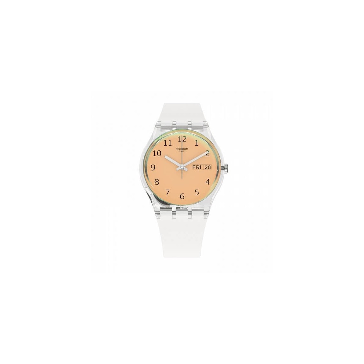 Orologio Swatch, della collezione Ultrasoleil, con funzione di solo tempo e movimento al quarzo. L'orologio presenta un simpatico e giovanile cinturino in silicone di colore bianco, con chiusura a fibbia in plastica e cassa media di colore trasparente, quadrante beige con lancette argentate e numeri di colore nero con vetro Solar Spectrum.