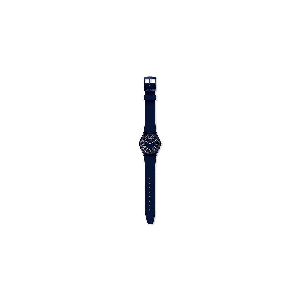 Orologio Swatch, della collezione Gent, modelo Back in Time, con funzione di solo tempo e movimento al quarzo. L'orologio presenta un simpatico e giovanile cinturino in silicone di colore blu, con chiusura a fibbia in plastica e cassa media di colore blu, quadrante con numeri e lancette dorate.