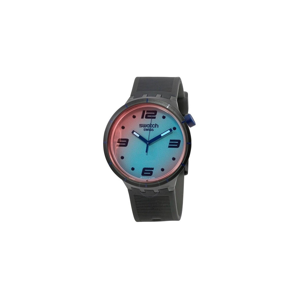 Orologio Swatc Futuristic Grey della collezione Monthly Drops Big Bold con movimento solo tempo al quarzo, cassa in plastica di colore nero e di forma rotonda da 47 mm, cinturino in silicone di colore nerocon quadrante Solar Spectrum