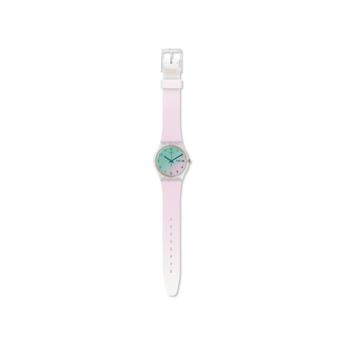 Orologio Swatch ultrarose della collezione Gent Standard con movimento solo tempo al quarzo, cassa in plastica di colore trasparente e di forma rotonda da 34 mm e cinturino in silicone di colore rosa chiaro sfumato