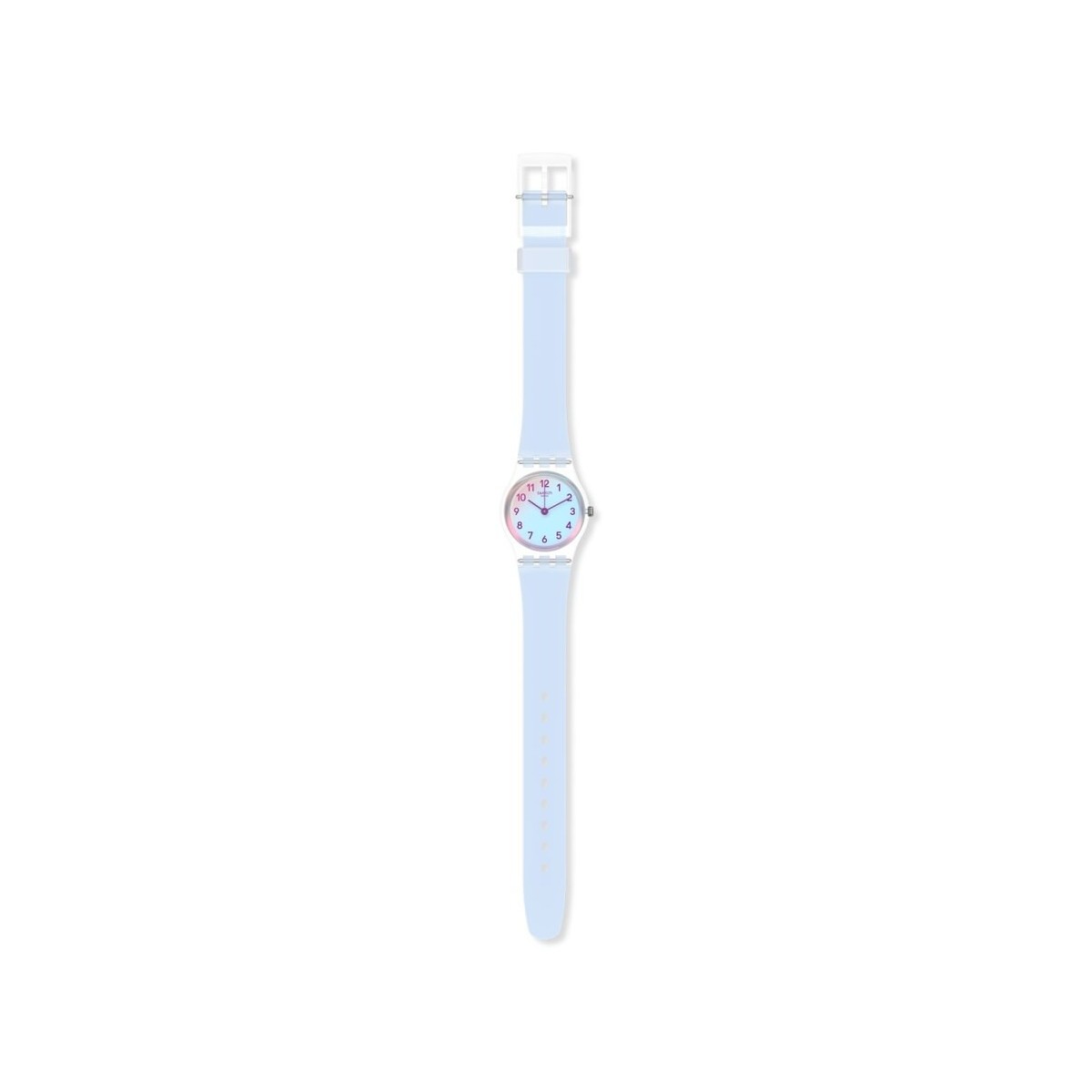 Orologio Swatch casual blue della collezione Lady con movimento solo tempo al quarzo, cassa in plastica di colore trasparente e di forma rotonda da 25 mm e cinturino in silicone di colore azzurro
