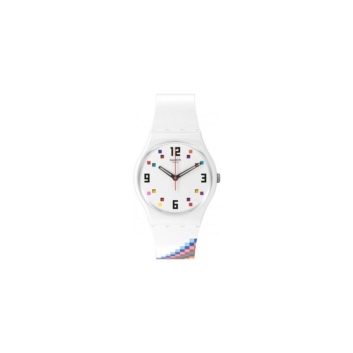 Orologio Swatch Merry Go Round Squares della collezione Swatch The March Collection, presenta una stampa bianca opaca con pixel colorati su cinturino in silicone con chiusura a fibbia ad ardiglione in plastica bianco, quadrante bianco e multicolore in materiale biologico da 34 mm. Lo speciale meccanismo a ruota del calendario fa in modo che il motivo pixelato del quadrante cambi colore una volta al giorno. Lancette nere scheletrate. Movimento al quarzo.