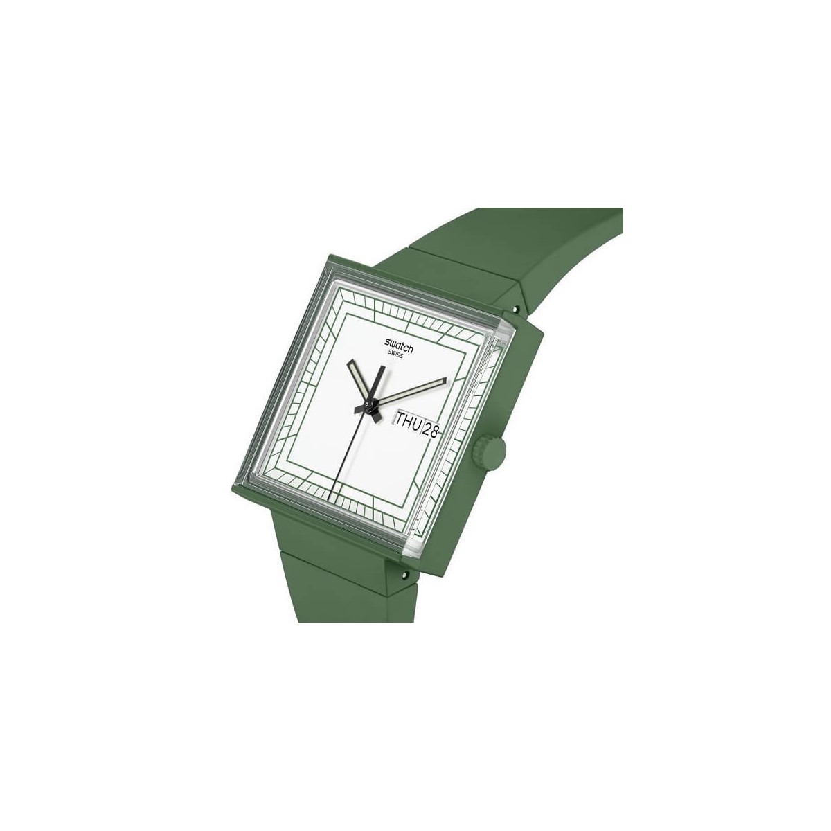 L'orologio What if green con cassa quadrato bioceramic è caratterizzato da un vetro biosurced edge-to-edge che permette una visione laterale delle lancette dell'orologio. Il quadrante quadrato è dotato di lancette che si illuminano al buio e a ore 3 di una finestra con la data del giorno. Il quadrante è completato da un cinturino integrato in materiale biosurced. Un copribatteria stampato sul retro raffigura uno dei quadranti che hanno ispirato questo orologio quadrato bianco.