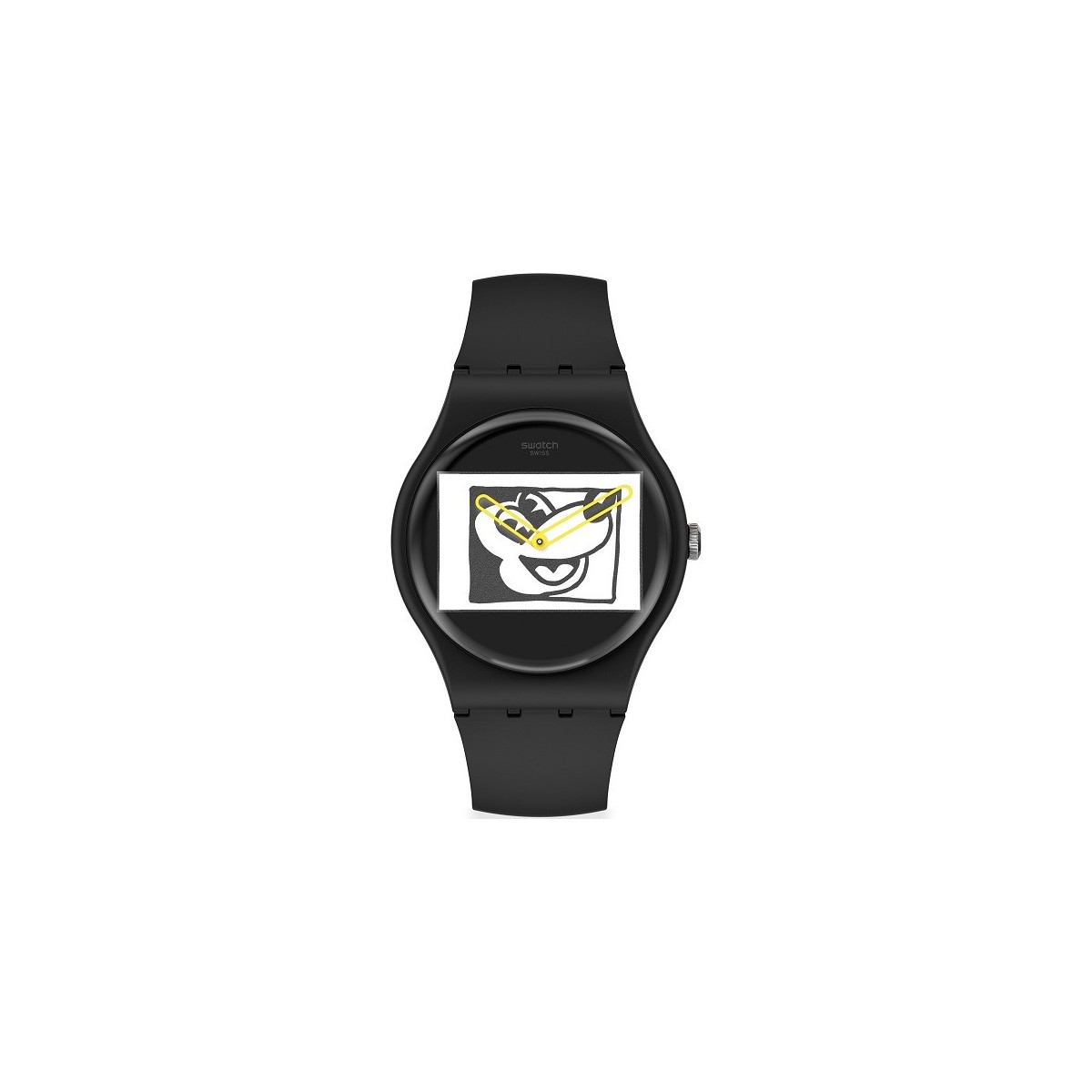 Orologio Swatch New Gent, della collezione Keith Haring modello Mickey Blanc Sur Noir, con funzione di solo tempo e movimento al quarzo. L'orologio presenta un simpatico e giovanile cinturino in silicone di colore nero, il quadrante presenta il simpatico personaggio della Disney, Topolino. Con chiusura a fibbia in plastica e cassa media di colore nero. Lancette di colore giallo.