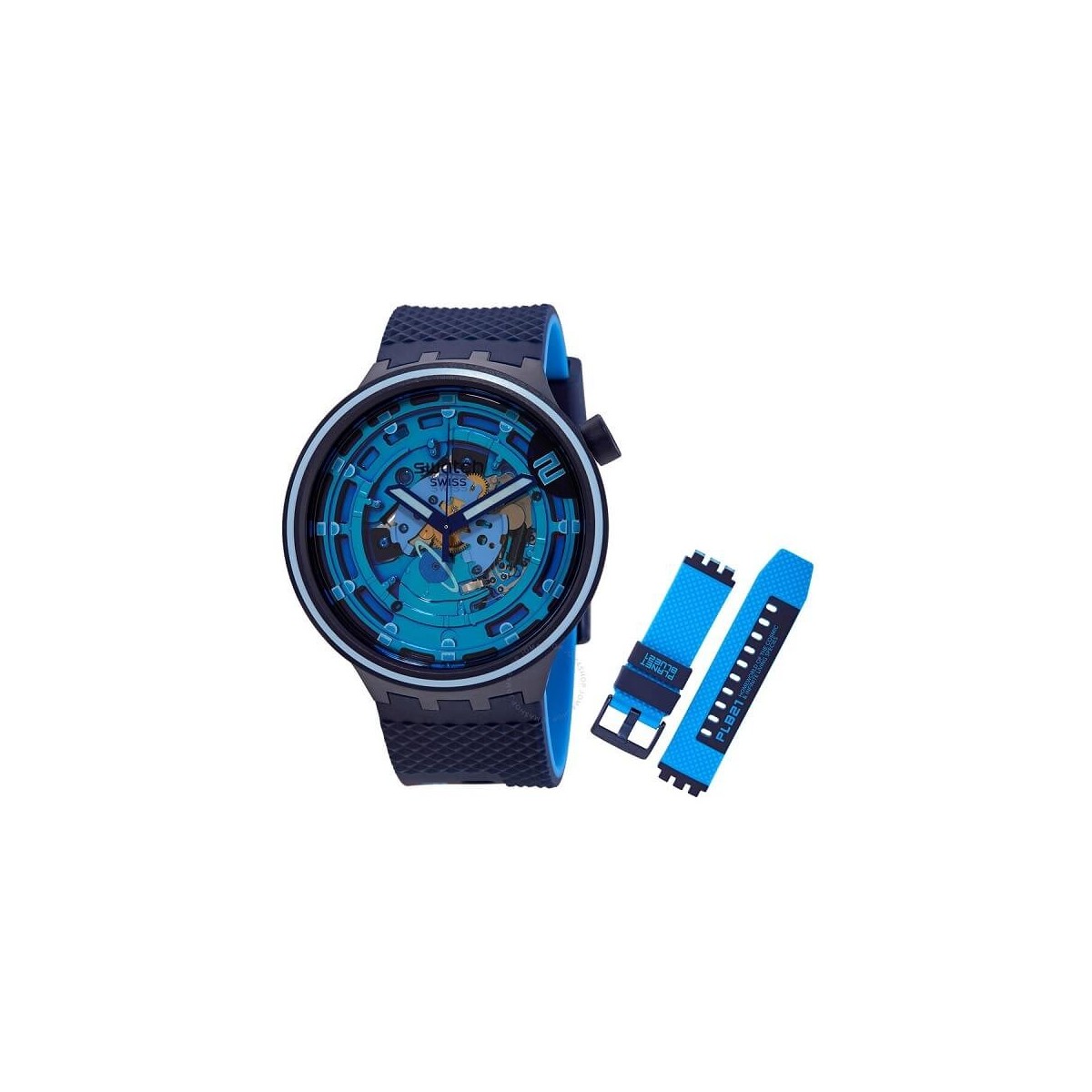 Orologio Swatch Second Home, disponibile con due cinturini in silicone ispirati allo spazio con design robusti, con Solar Spectrum sulla cassa. Il quadrante trasparente e lancette illuminate con Swatch Glow.