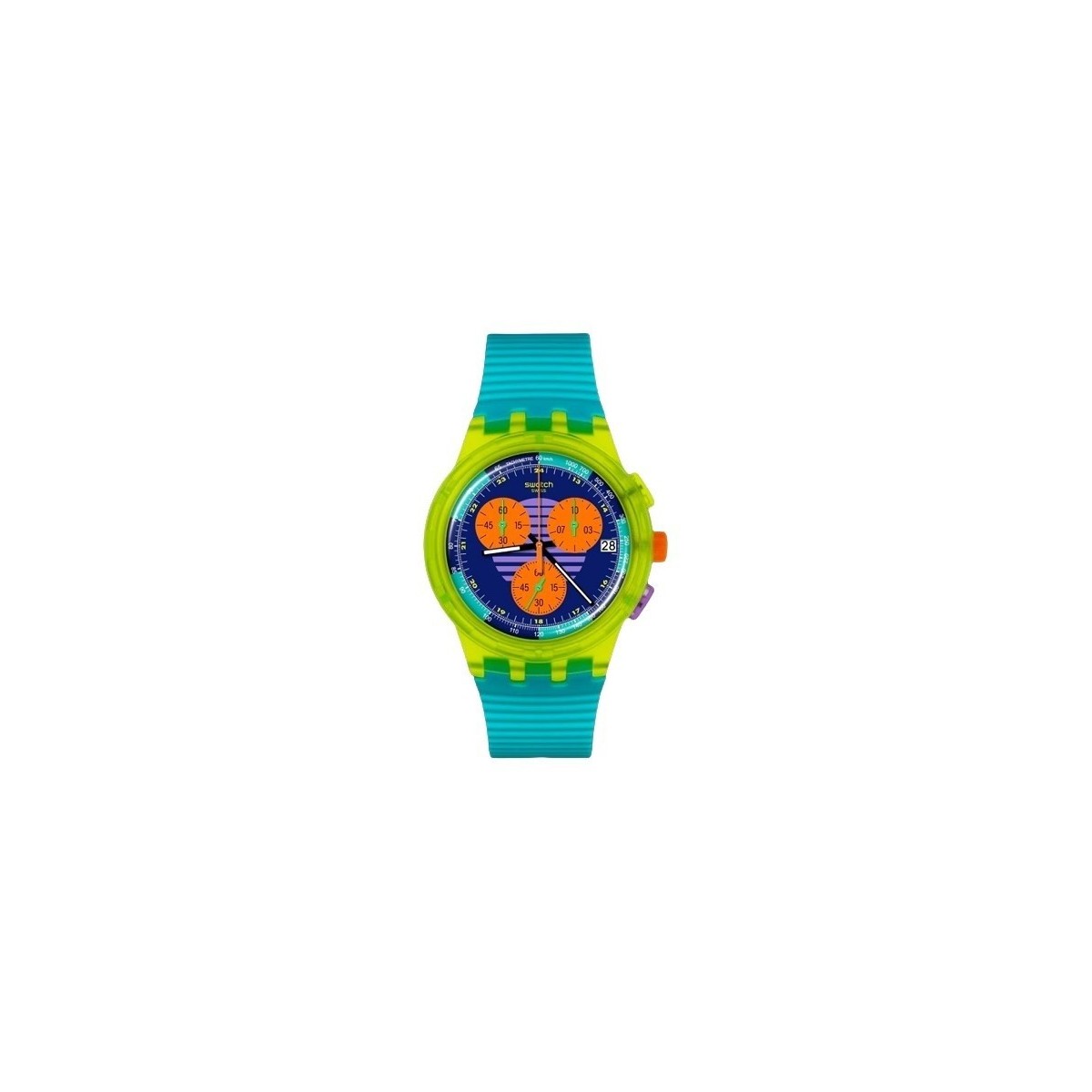 Orologio Swatch Neon Wave con funzione di cronografo al quarzo. Realizzato con quadrante multicolore con scala tachimetrica con lancette nere che si illuminano al buio per le ore e per i minuti, una lancetta arancione per i secondi e una finestra per il giorno a ore 3. La cassa è di colore giallo opaco trasparente con lunetta in tinta. Il cinturino strutturato di colore turchese è impreziosito da passanti a contrasto trasparenti giallo opaco e arancione e da una fibbia ad ardiglione blu opaco trasparente.