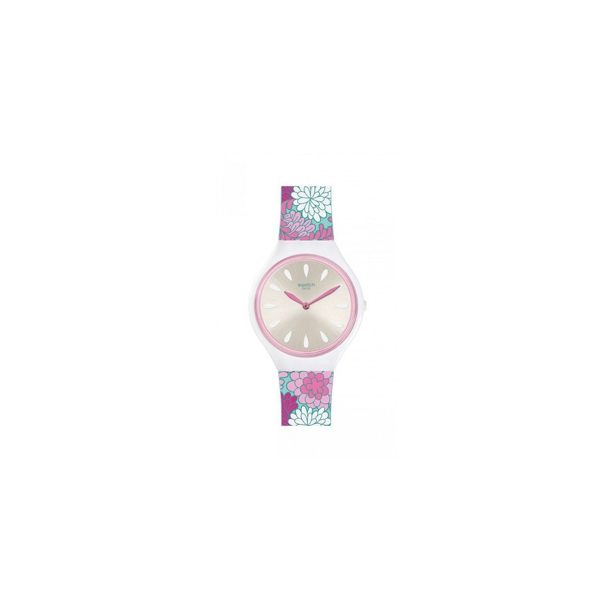 Orologio Swatch della linea Skinpivoine, con funzione di solo tempo e movimento al quarzo. L'orologio presenta un cinturino in silicone di colore turchese con stampa floreale, quadrante argento.