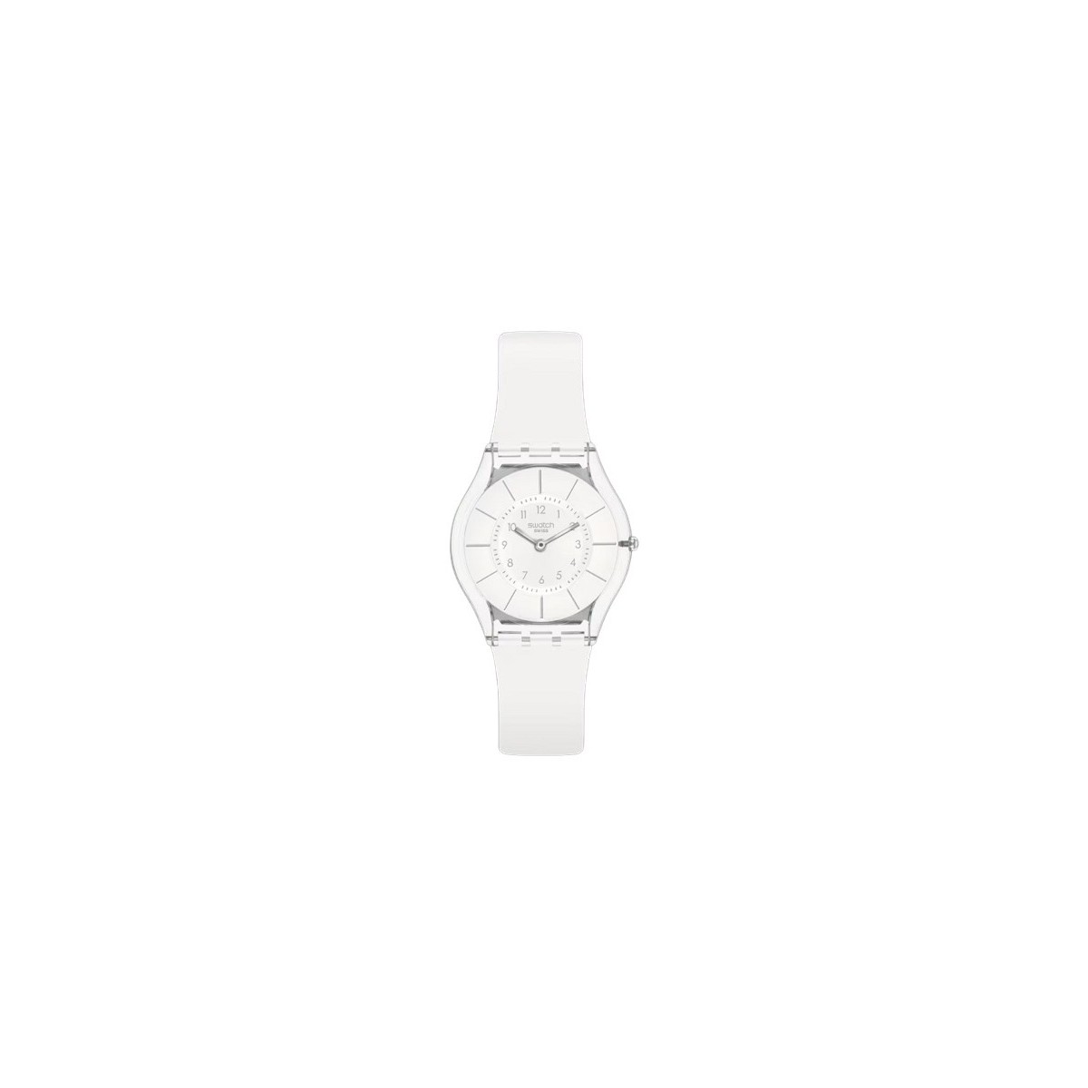 Orologio Swatch White Classiness, della collezione Skin Swatch Lifestyle Collection, realizzato con quadrante bianco e da indici argentati,con movimento al quarzo, vetro in perspex che protegge il quadrante da eventuali urti e graffi. Cinturino in silicone di colore bianco ultrasottile e una cassa in plastica trasparente. Impermeabile fino a 3 bar. Chiusura a fibbia.