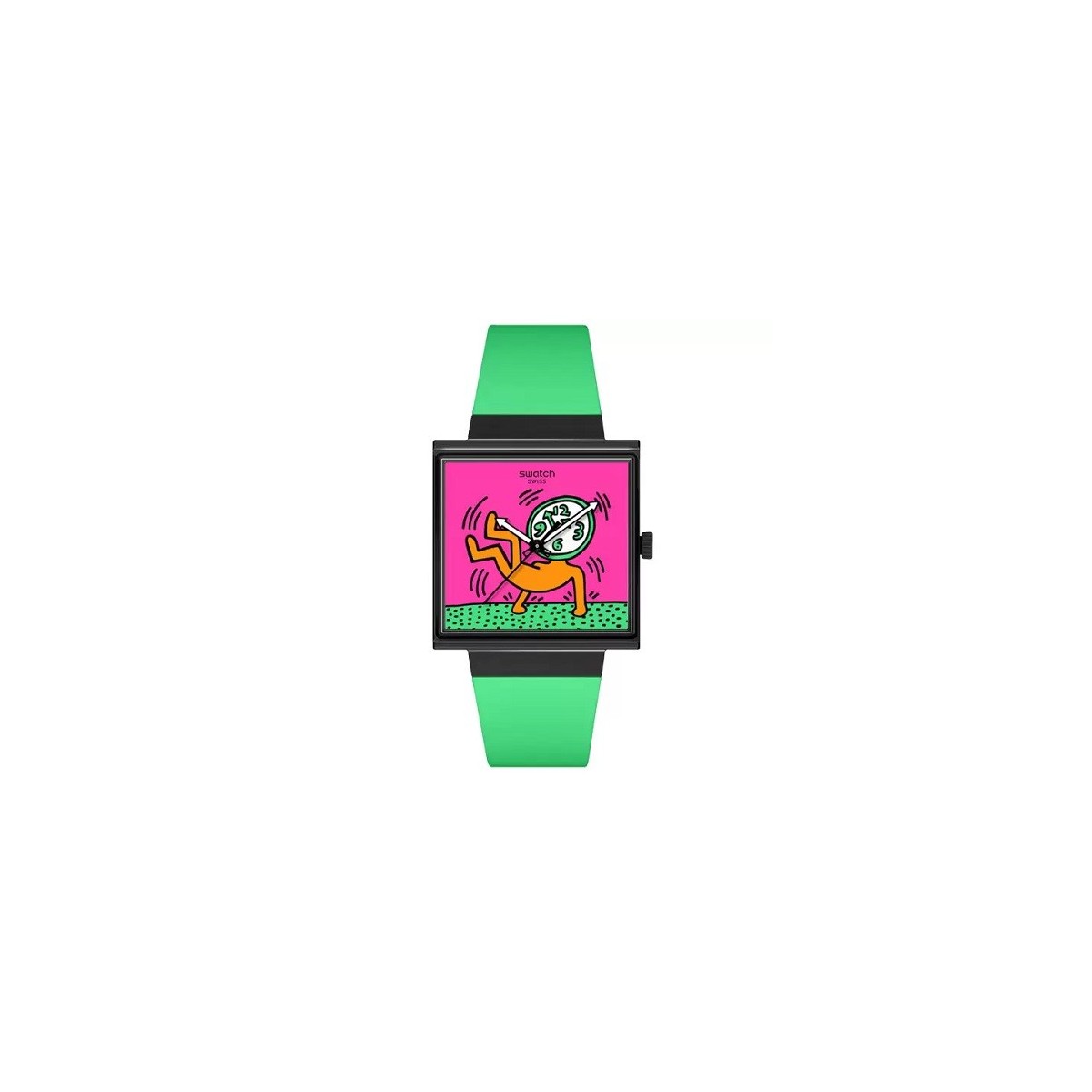 L'orologio Breaks Off con cassa quadrata bioceramic è caratterizzato da un vetro biosurced edge-to-edge che permette una visione laterale delle lancette dell'orologio. Il quadrante multicolore quadrato è dotato di lancette fosforescenti a forma di freccia per le ore e i minuti e una lancetta nera per i secondi.