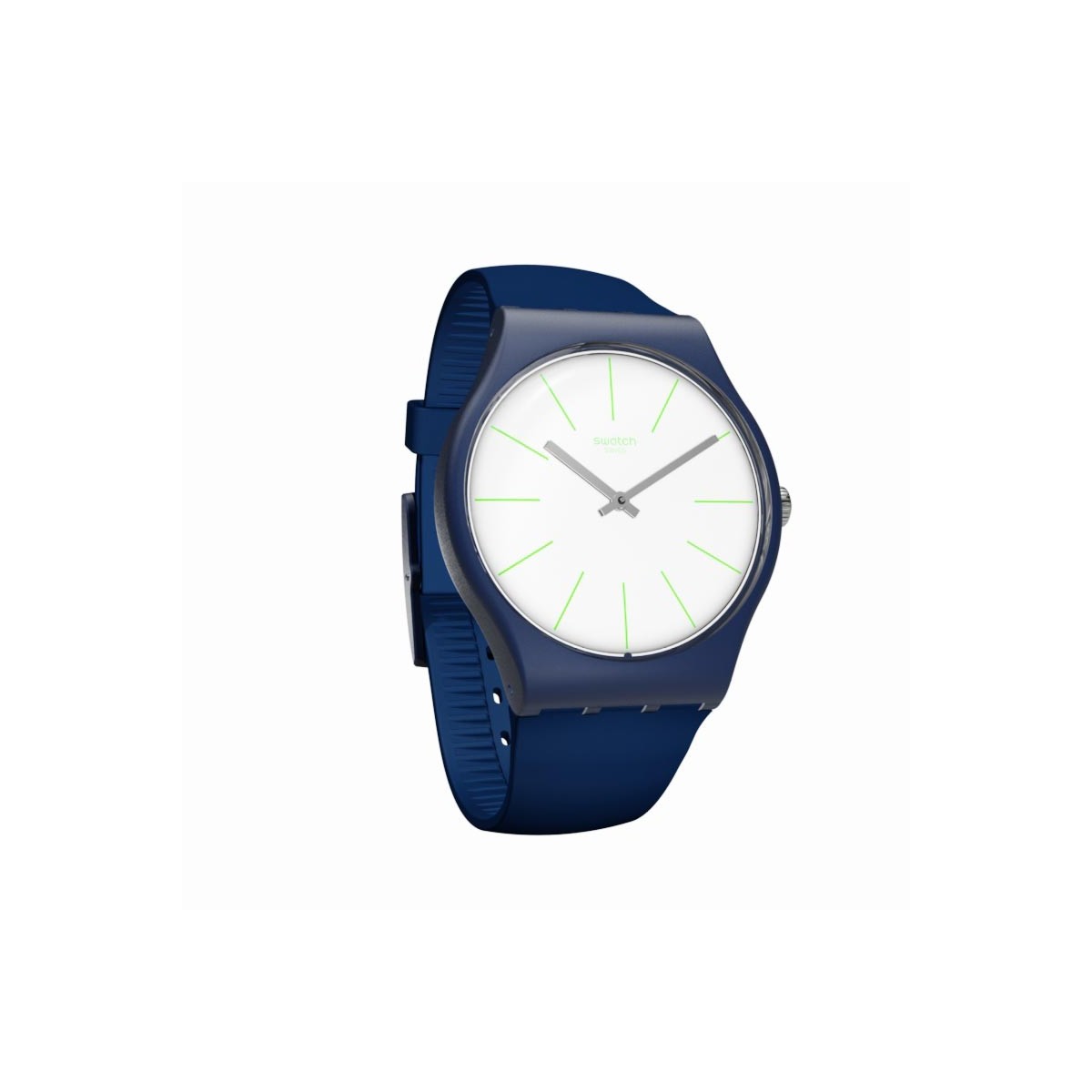 Quadrante bianco con indici verdi e cassa blu opaco. Il look monocromatico prosegue sul cinturino in silicone opaco blu scuro, con passanti coordinati e fibbia in plastica satinata blu.