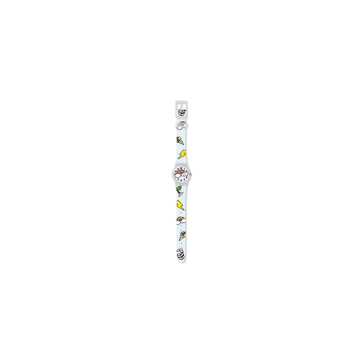 Orologio unisex in silicone con cassa in policarbonato, base bianca e fantasia multiforme come palma, fulmine, gelato, quadrnate con disegno arcobaleno, numeri arabi e lancette con luminova