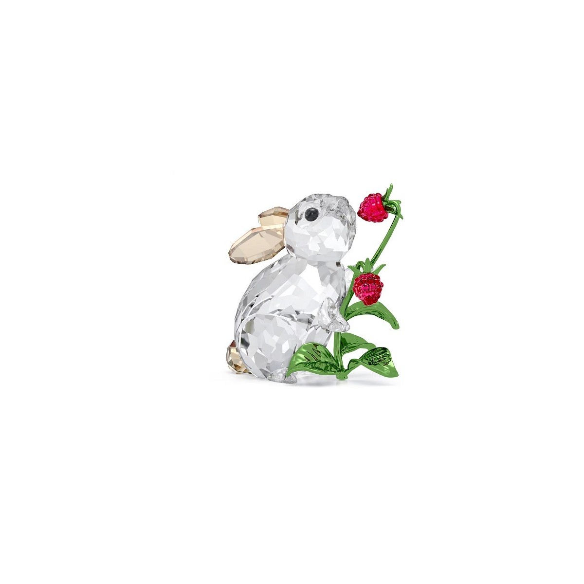 Coniglio Swarovski, della collezione Idyllia, realizzato con 374 sfaccettature, mostra un coniglietto immerso nella natura che sgranocchia dei lamponi rossi.