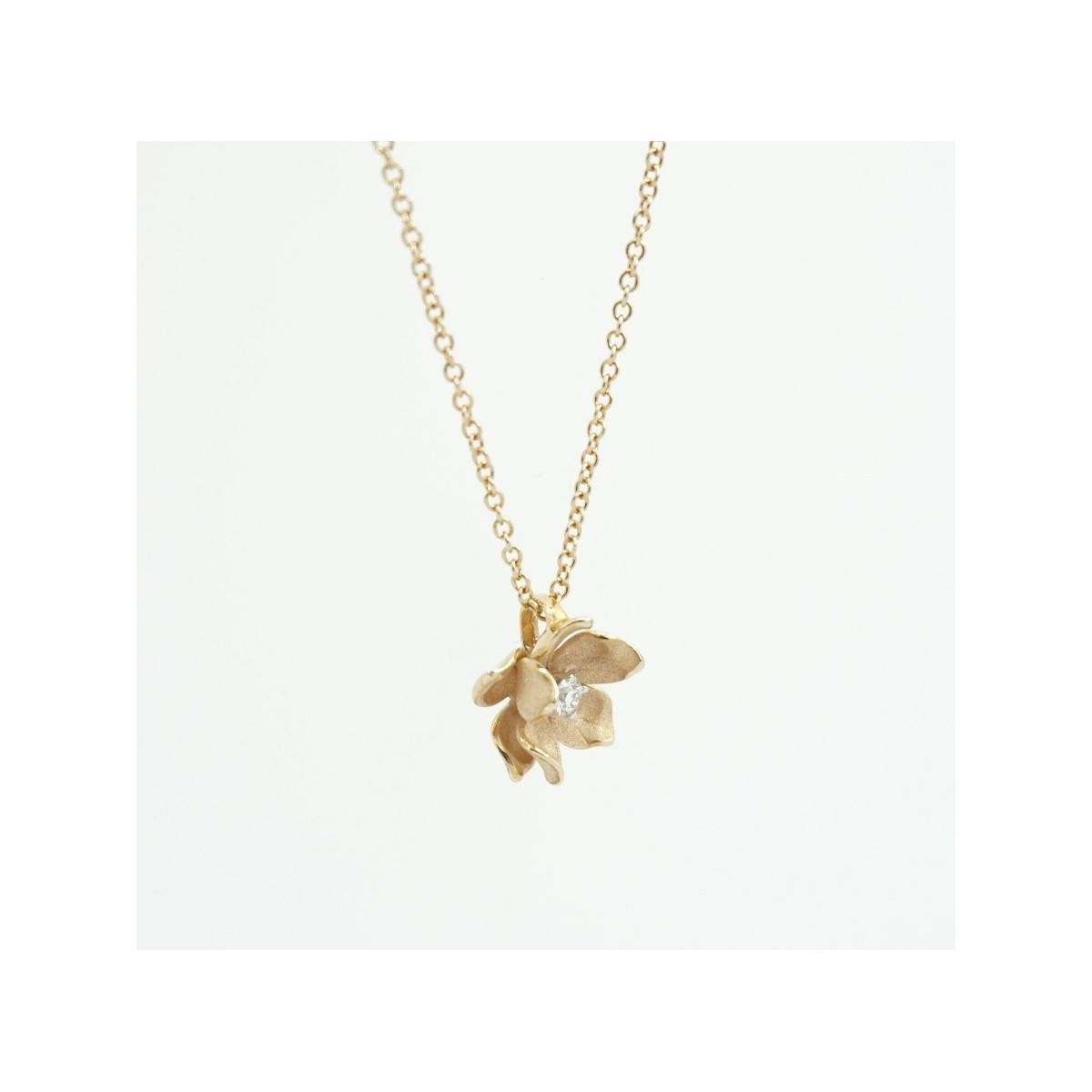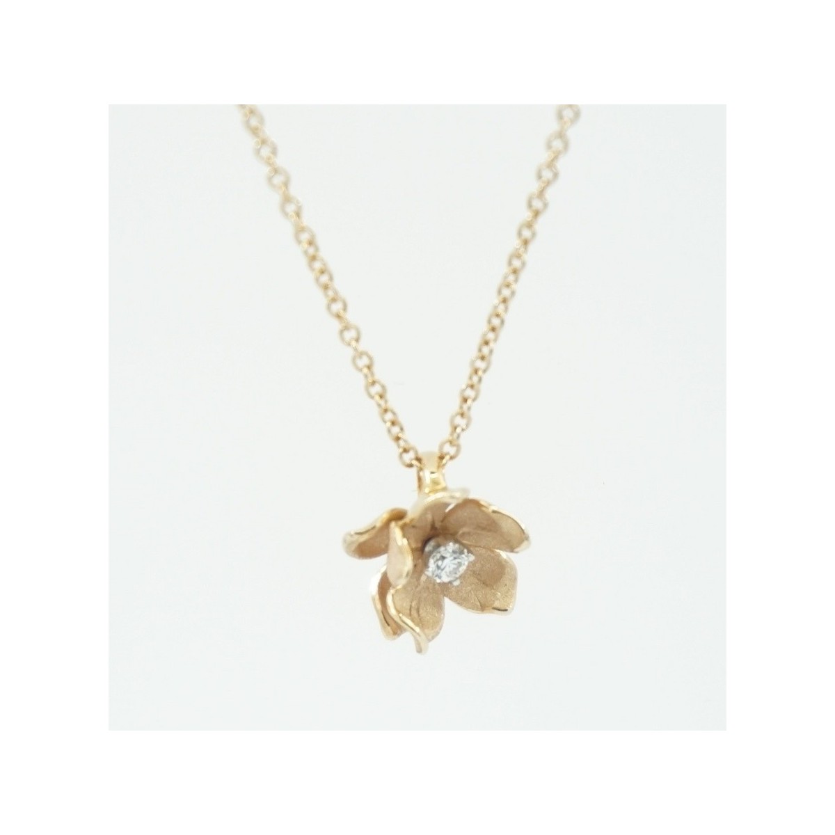 Collana con pendente fiore realizzato in oro color arancio 18kt e centralmente un Diamante Naturale taglio Brillante