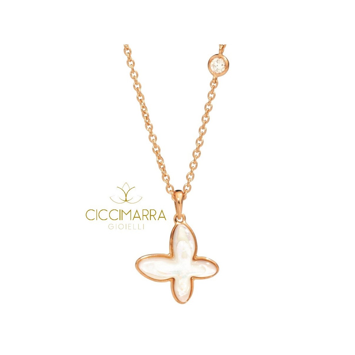 Particolarità di questa collana è la farfalla in madreperla e la montatura in oro rosa creata a su misura della madreperla.