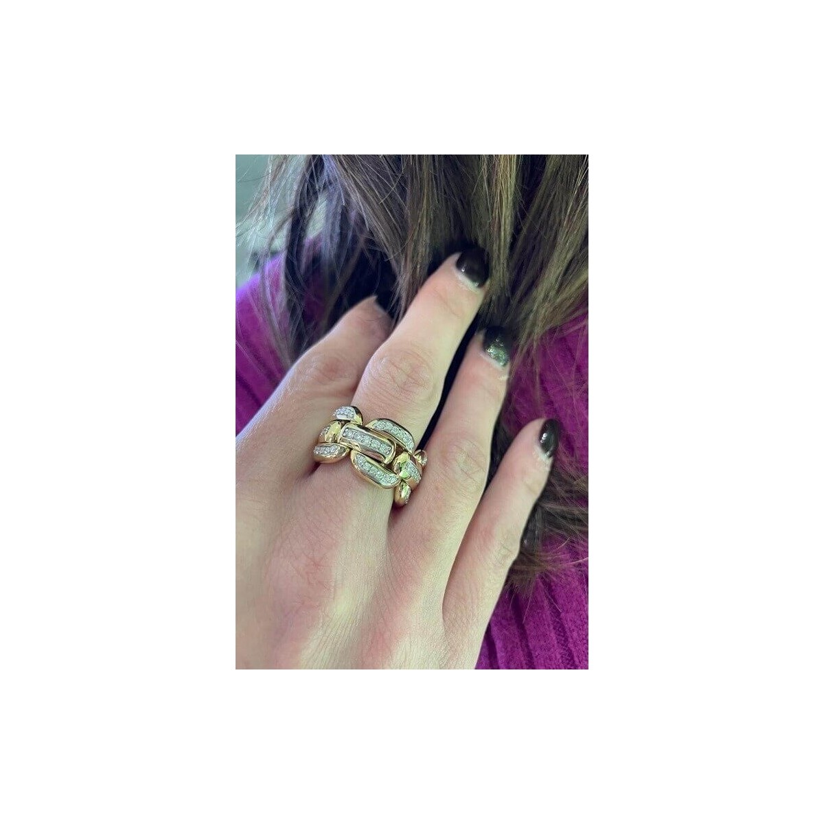La collezione X-Tend di Chimento è caratterizzata da elementi concatenati in modo sequenziale, in questo particolare modello su ogni elemento sono incastonati diamanti naturali che in totale realizzano un effetto full pavè molto luminoso.