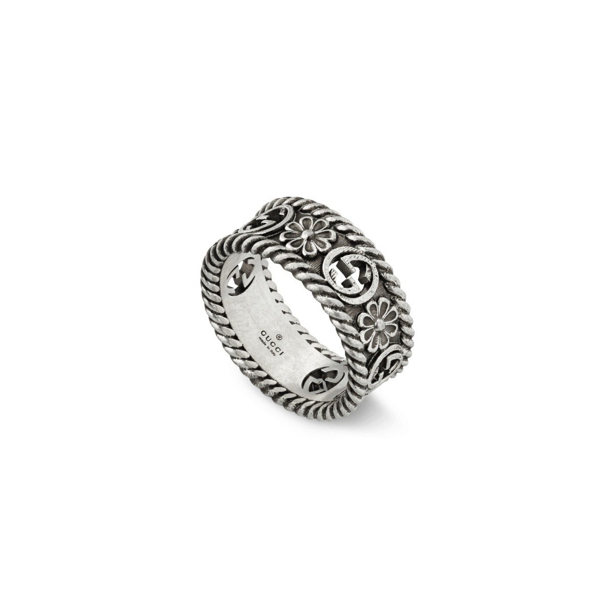 Anello collezione Interlocking G a fascia sottile in argento con motivo fiore in cui Fiori e logo GG si alternano nel motivo intagliato che decora questo bracciale in argento anticato, rifinito con profili torchon.