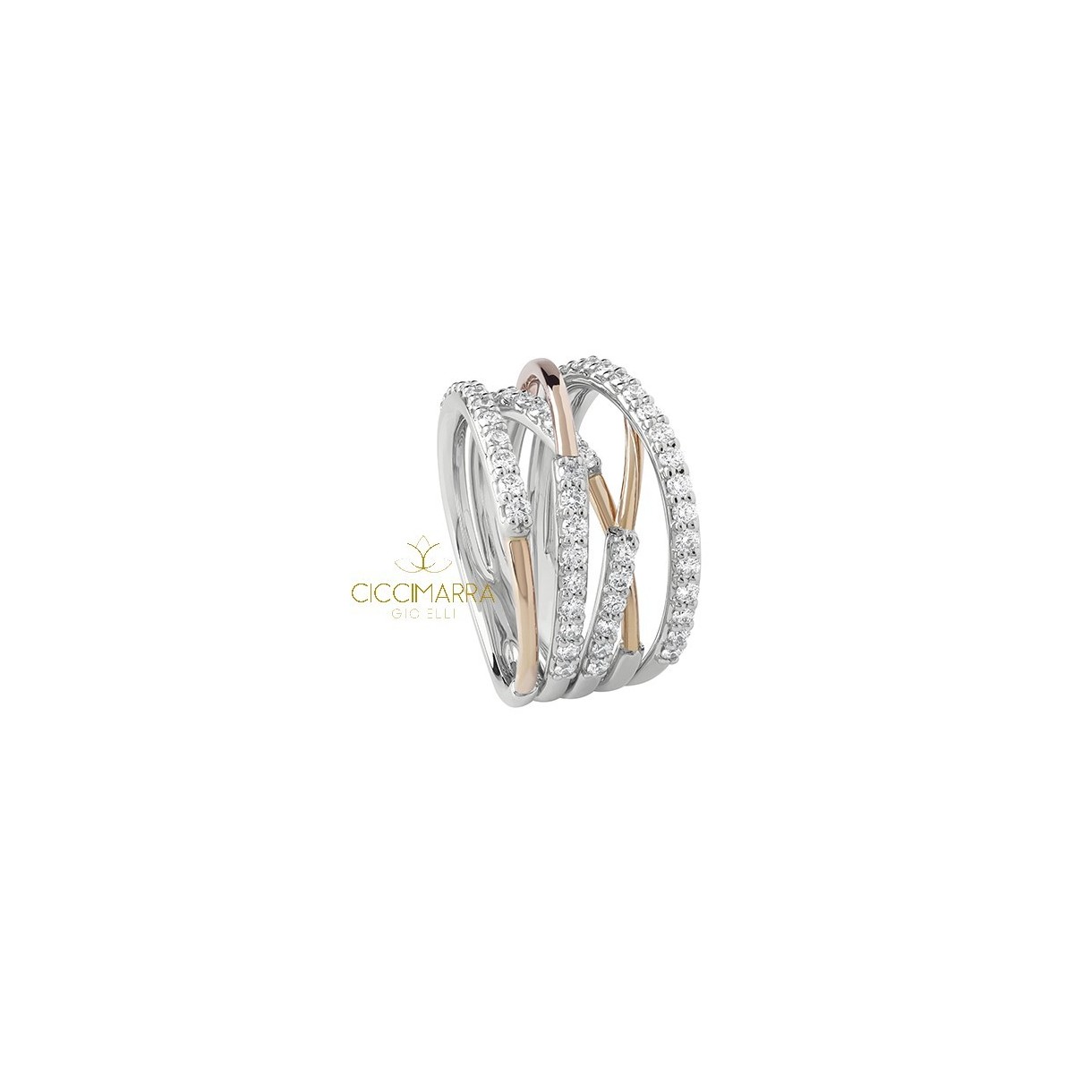 Anello in oro bianco e rosa 750/1000 composto da cinque fascette con diamanti naturali taglio brillante incastonati.