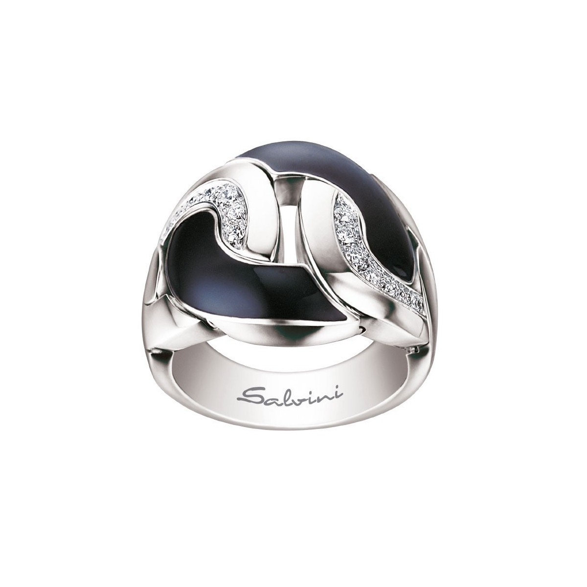Anello in oro bianco 750/1000 composto da una base bombata e intagliata con decori neri e pavè di diamanti naturali.