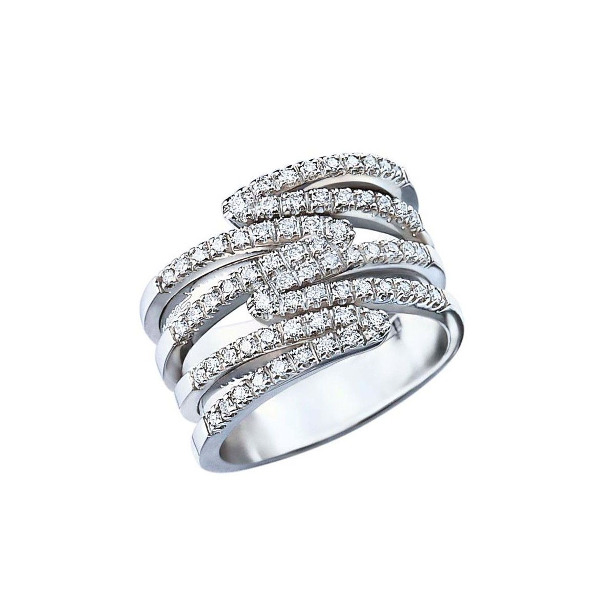 Anello in oro bianco 750/1000 composto da quattro fascette biforcate che si chiudono su quattro livelli uniti tra loro da una fascia in oro bianco 18 kt, mentre sulla parte anteriore, sulle otto fascette sopraelevate, troviamo incastonati diamanti naturali taglio brillante.