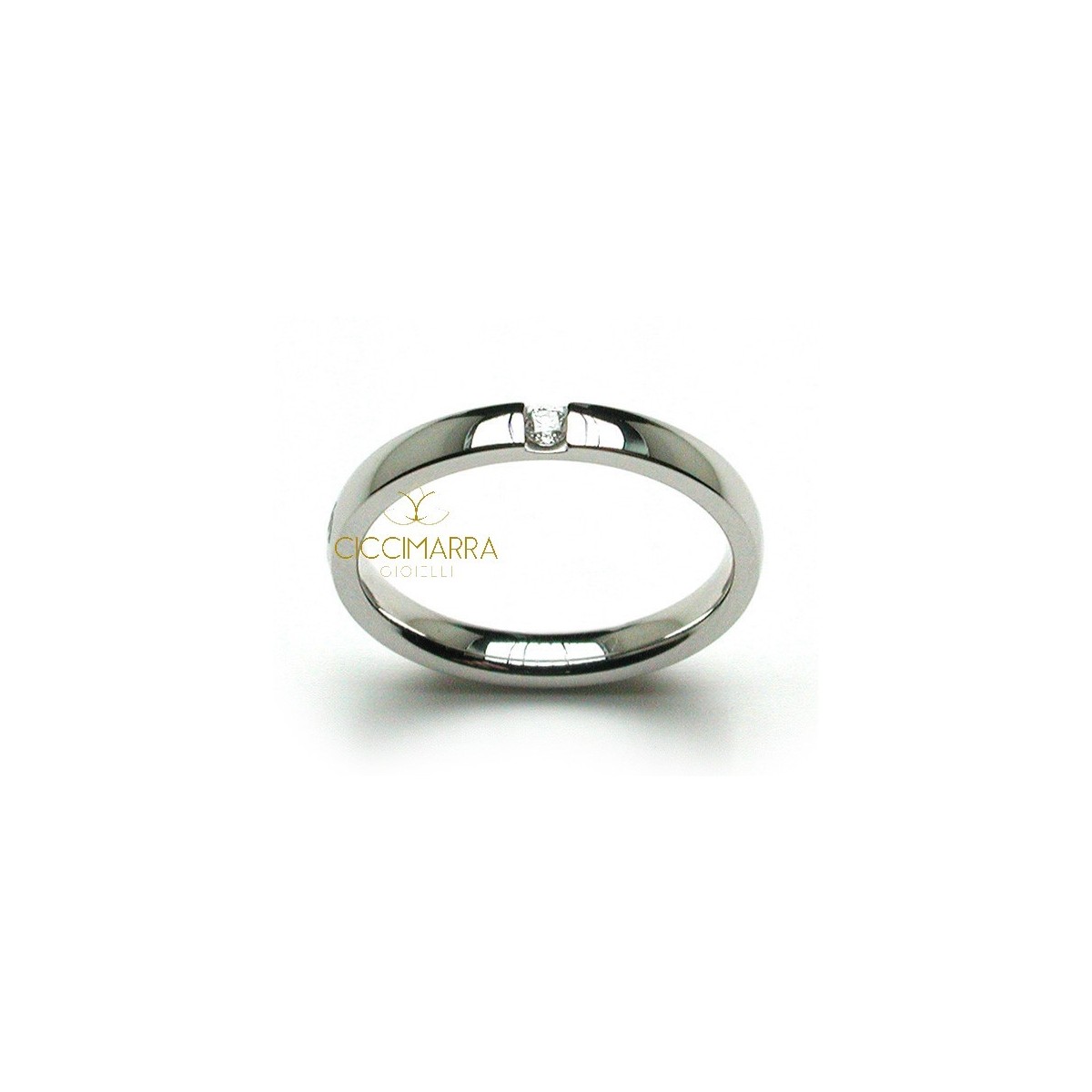 Anello in oro bianco 750/1000 con un diamante solitario naturale con taglio brillante incastonato sulla base.