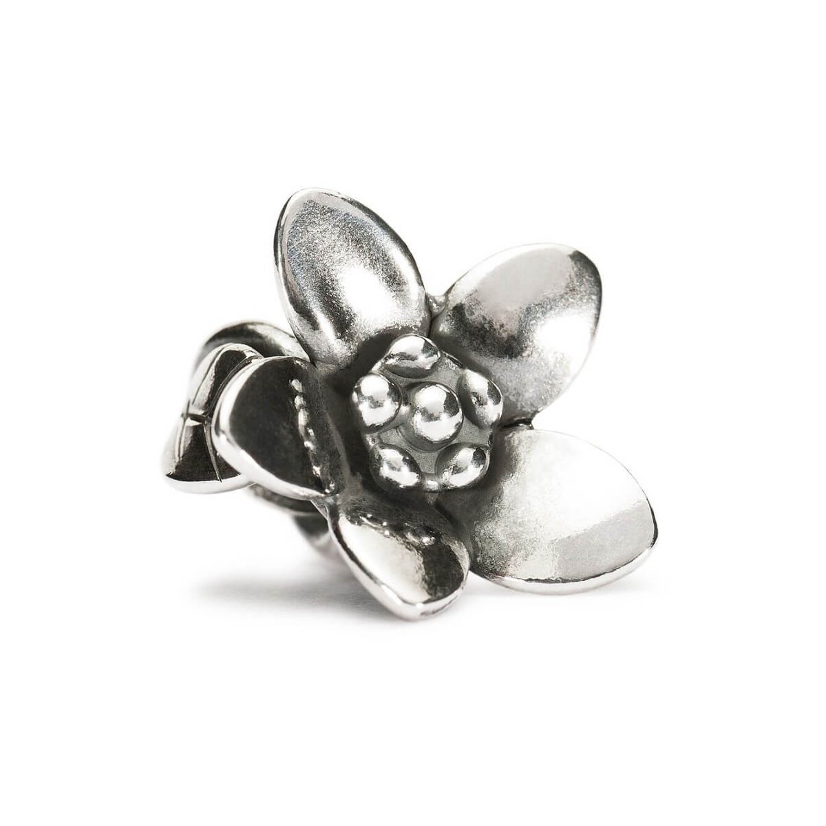 Bead fuori produzione in argento 925 raffigurante un fiore con una foglia laterale.