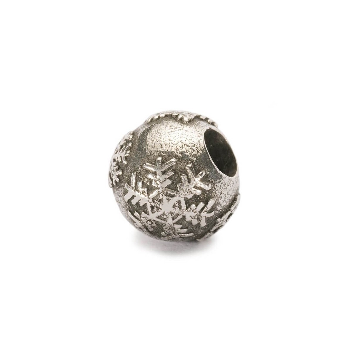 Bead fuori produzione in argento 925 a forma sferica brunita con disegni di fiocchi di neve.