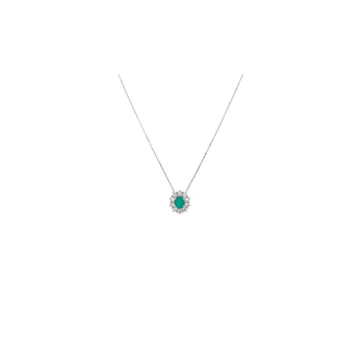 Collana girogola Bliss da donna, della collezione Charleston, realizzata in oro bianco 18 carati con catena lunga 42 cm e smeraldo verde intenso da 0,35 carati impreziosito da una corona di diamanti naturali taglio brillante di 0,15 carati.